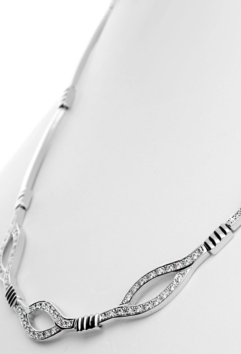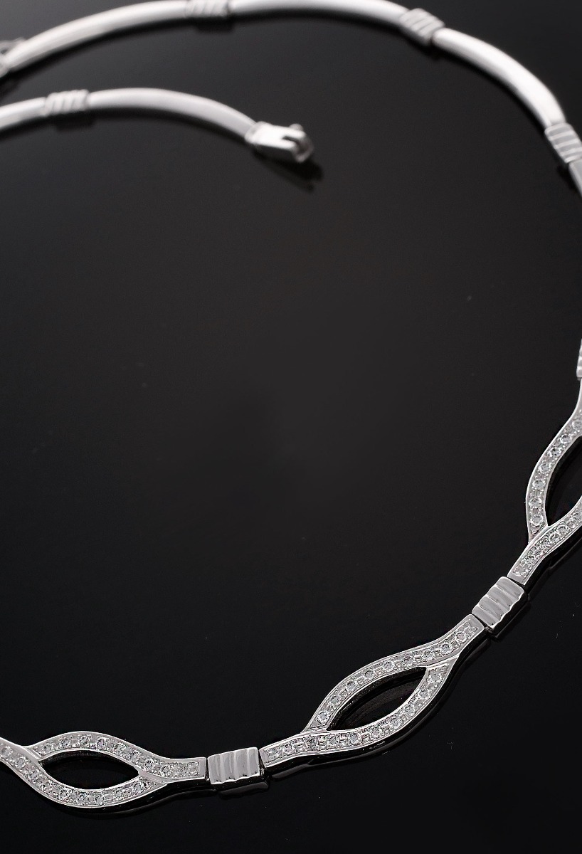 Gargantilla oro blanco 18 kilates con diamantes, un diseño especial para la mujer más especial, gargantilla rigidaformada por tramos rectangulares y cuatro motivos centrales de galeria con diamantes y de forma ojival, realmente una joya espectacular para brillar en las ocasiones másespeciales, realizada artesanalmente dispone de un broche de seguridad tipo lengüeta y cerrojillo lateral de ocho. Regalo perfecto para dejar una impronta eterna de un momento especial que siempre se quiera recordar, estamos ante una joya patrimonial que tanto por su valor economico como y más importante por el valor sentimental que puede alcanzar marcara siempre ese momento.