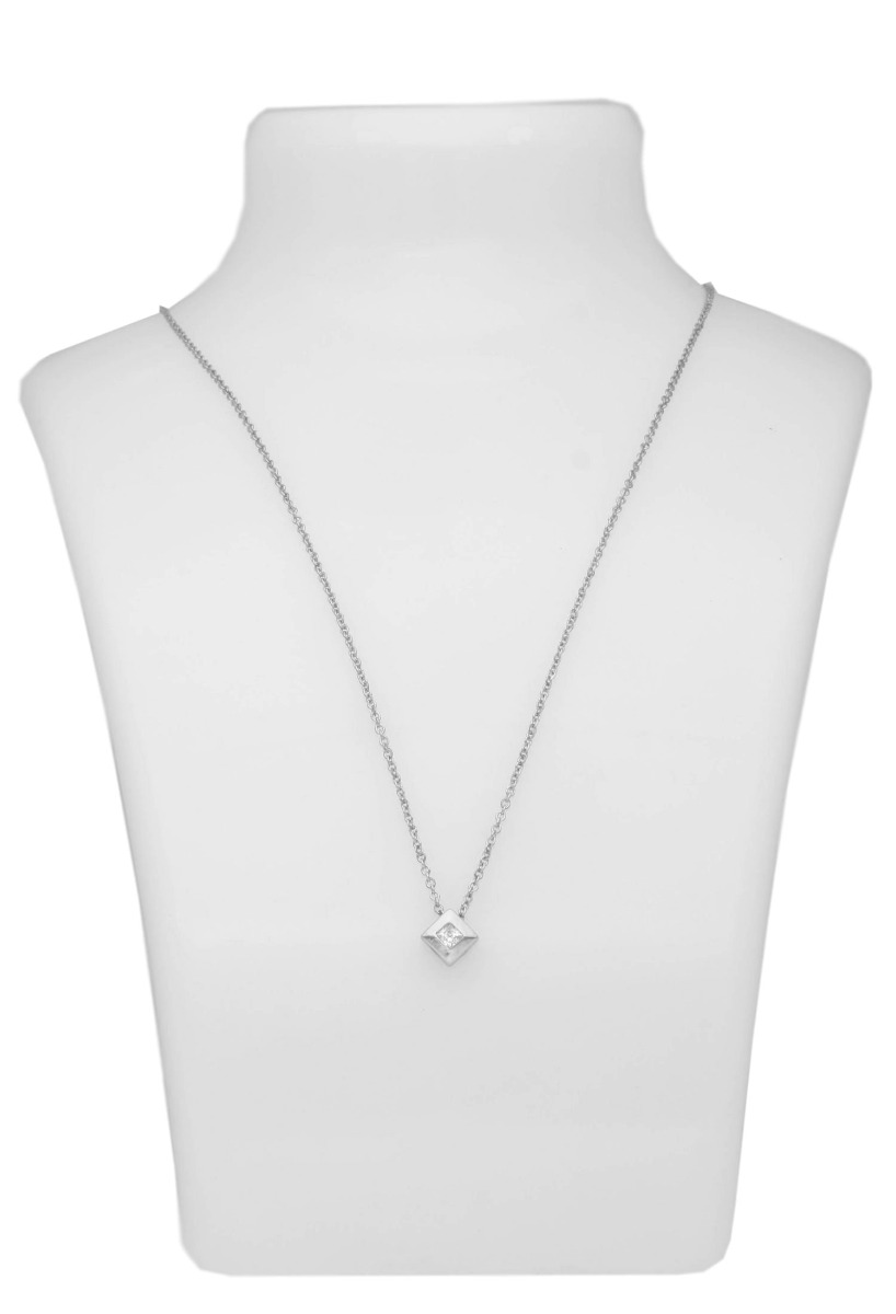 Gargantilla oro blanco 18 kilates motivo romboide con circonita, cadena fina de eslabones forzados huecos con cierre tipo reasa, el colgante es un chatón cuadrado dispuesto en forma de rombo que engasta a ras una circonita central, el regalo ideal que siempre le gustará lucir y que le recordará esa ocasión especial, aprovecha nuestro precio promocional y compra con toda garantía.