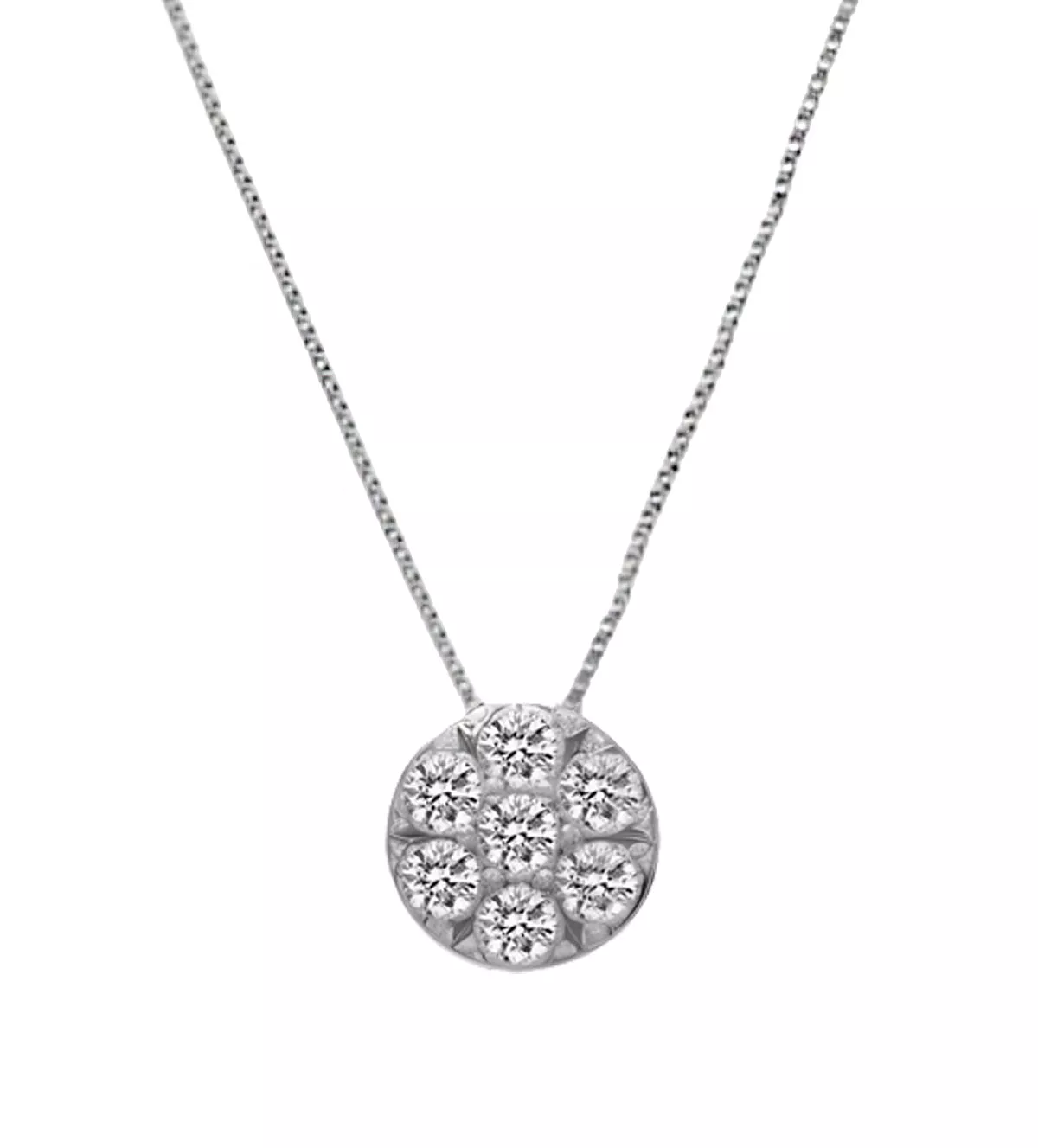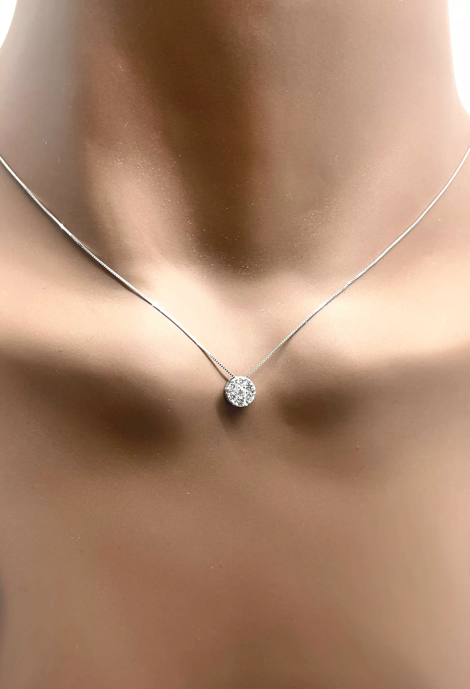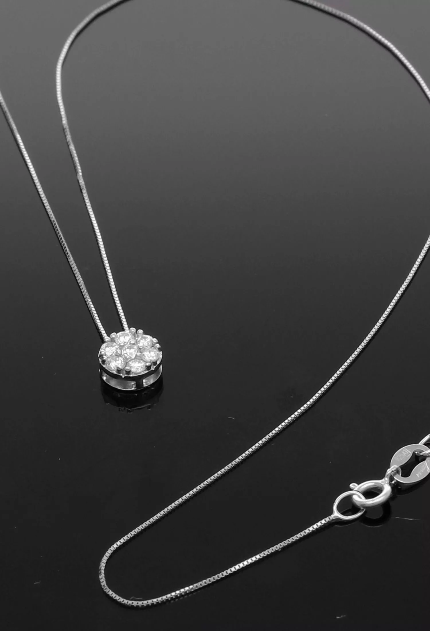 Gargantilla de oro blanco de 18 quilates con diamantes talla brillante, formando una deslumbrante roseta. El colgante, sin asa, permite que la cadena de eslabones venecianos pase a través del rosetón por su parte trasera. Este diseño sofisticado y elegante es ideal para cualquier ocasión, aportando un toque de lujo y distinción.