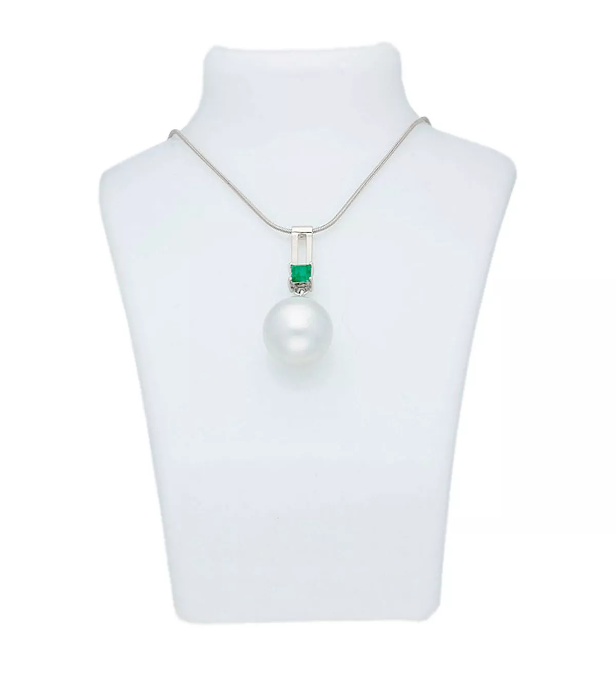 El oro blanco de 18 quilates, cuidadosamente trabajado en nuestro taller, aporta durabilidad y un brillo impecable. La perla australiana, con su diámetro de 14 mm, es una de las más valoradas en el mundo por su forma perfectamente esférica y su lustre excepcional. Además, la esmeralda talla cuadrada, engastada con precisión en una garra de cuatro grapas, otorga un toque de color y sofisticación único a esta gargantilla de oro.