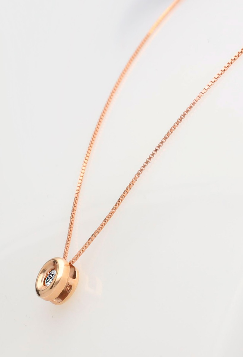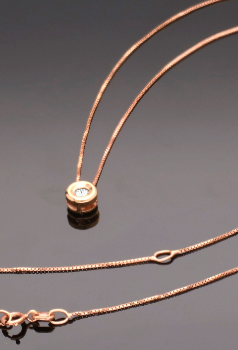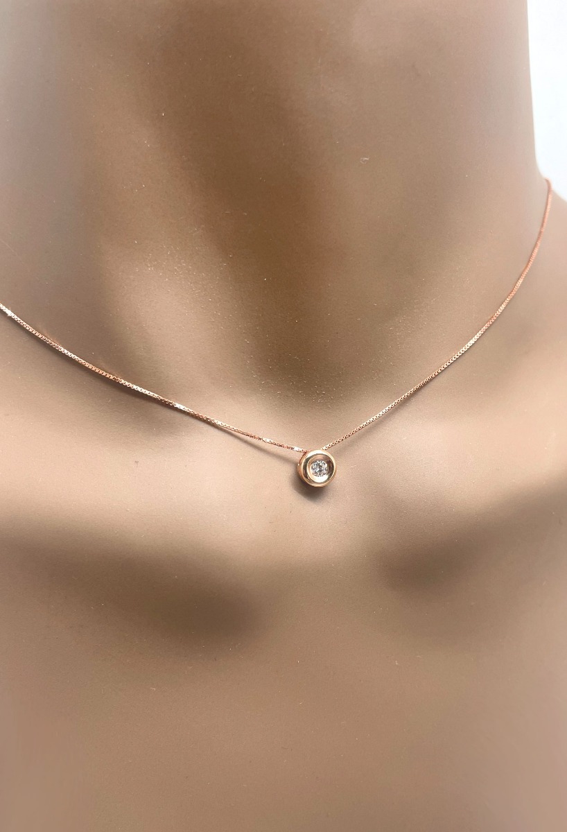 Gargantilla de oro rosa con diamante 18 kilates, una joya romántica para lucir esplendida en todas las ocasiones que la luzcas, formada por una cadena fina de eslabones venecianos que puedes abrochar a 40 o a 45 centímetros con un colgante tipo chatón de 6 milímetros de diámetro que lleva engastado un diamante talla brillante de 0,10 quilates color H y pureza VS, bonito obsequio de cumpleaños o cualquier otro tipo de evento.