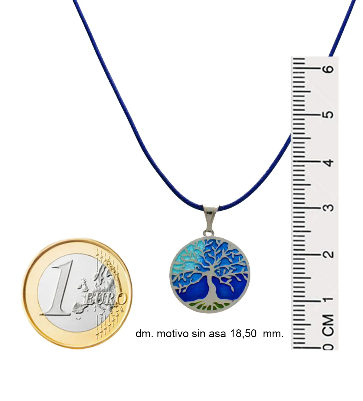 Lo que hace única a esta gargantilla de plata es su colgante redondo de 18,50 mm, que representa el Árbol de la Vida esmaltado a fuego. Los tonos azulados aportan profundidad visual y un aire místico. Esta técnica artesanal del esmaltado asegura un resultado duradero y resistente a desgastes. Además, el asa en forma de escudo permite intercambiar fácilmente el cordón por una cadena de plata o cuero, haciendo que esta joya se adapte a cualquier estilo.