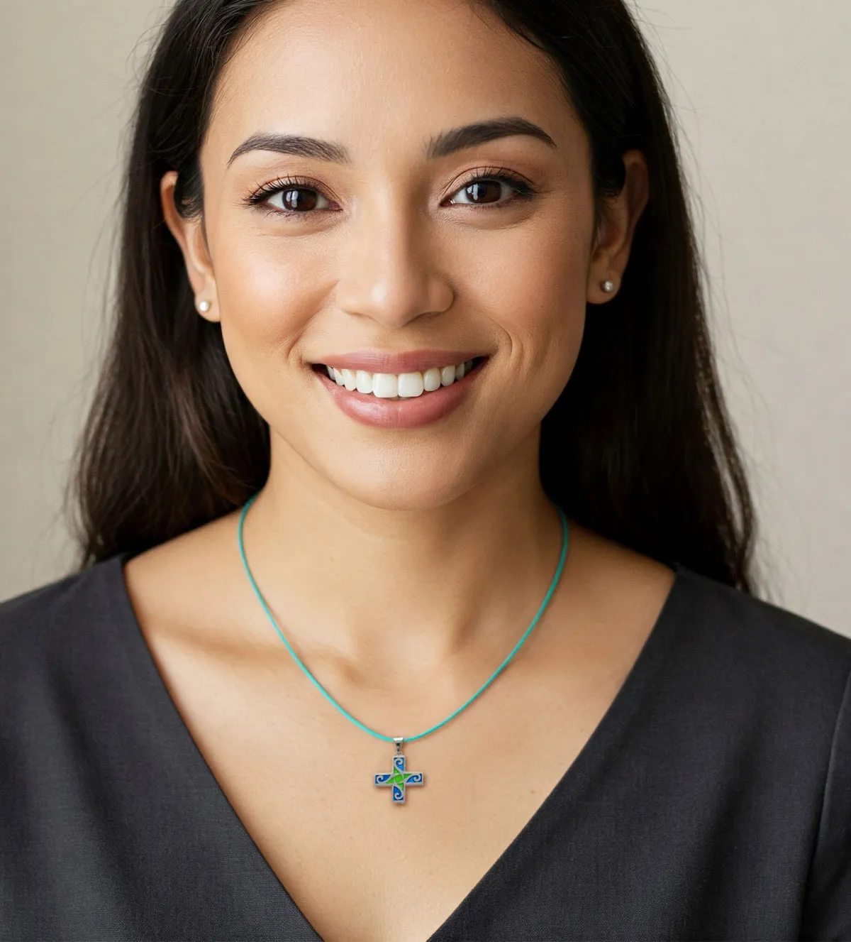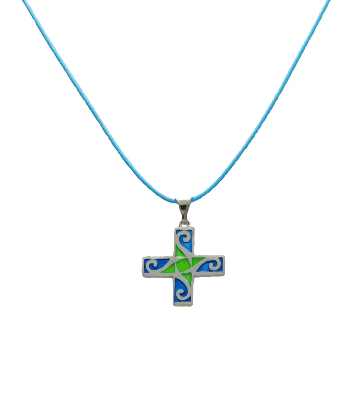 La protagonista de esta pieza es la cruz griega, reconocida por su forma simétrica y sus connotaciones de equilibrio y armonía. El esmaltado a fuego en verdes y azules ofrece un contraste visual que atrapa miradas al instante. El uso de un cordel azul realza el carácter artesanal y contemporáneo de la pieza, logrando un equilibrio perfecto entre lo tradicional y lo moderno.
