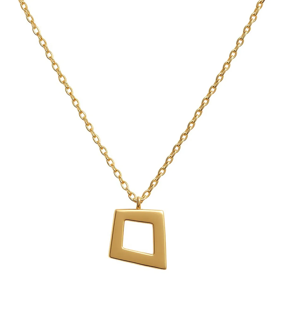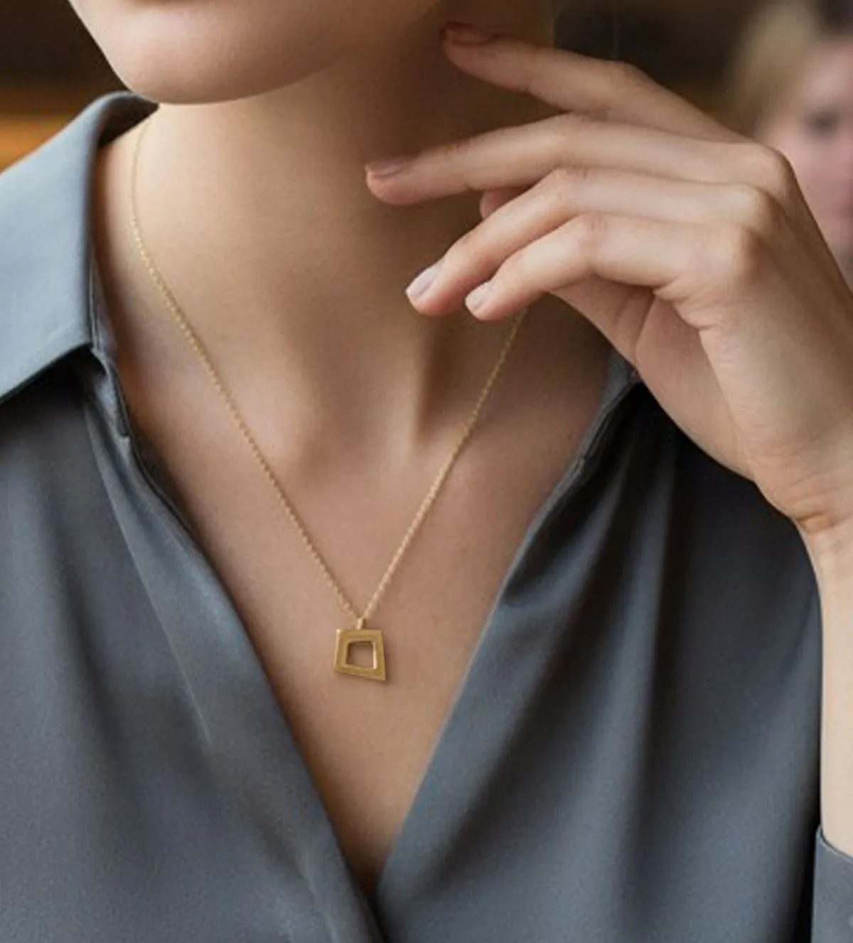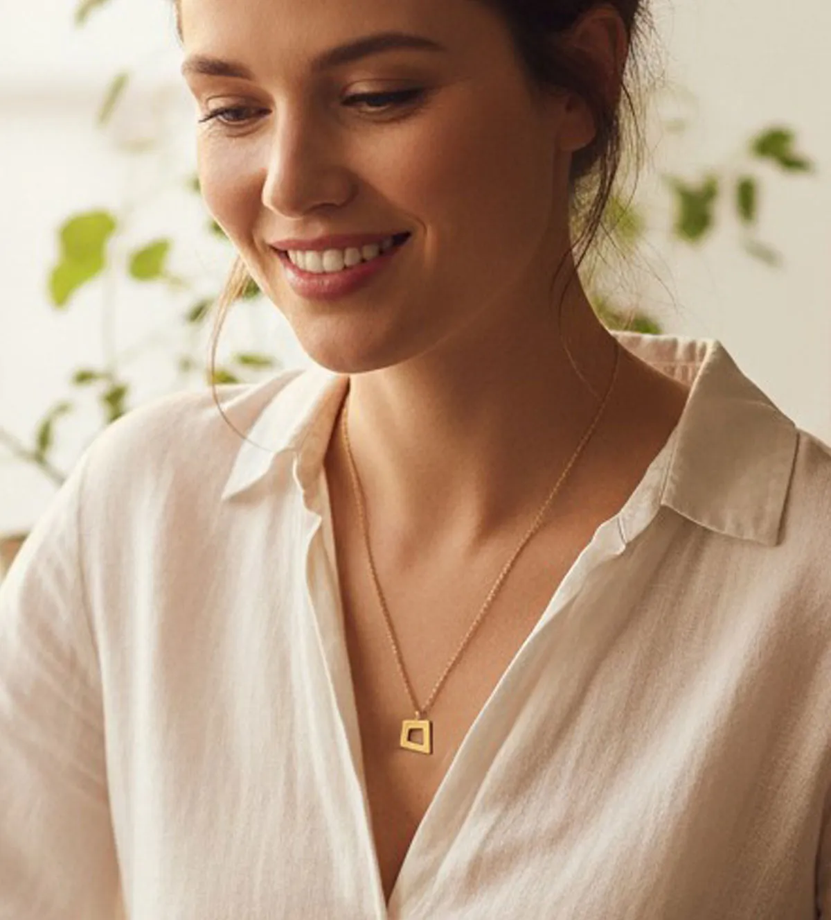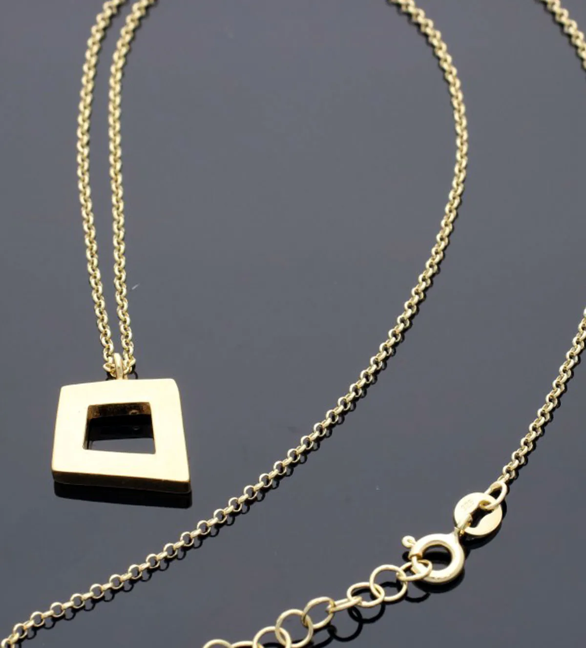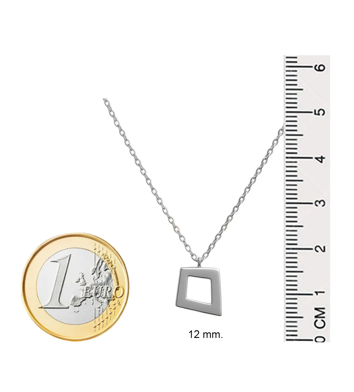 El diseño se compone de una cadena fina de eslabones forzados que aporta dinamismo y un acabado delicado. El protagonista es el motivo central en forma de rombo calado, una figura geométrica que introduce un toque moderno y minimalista.