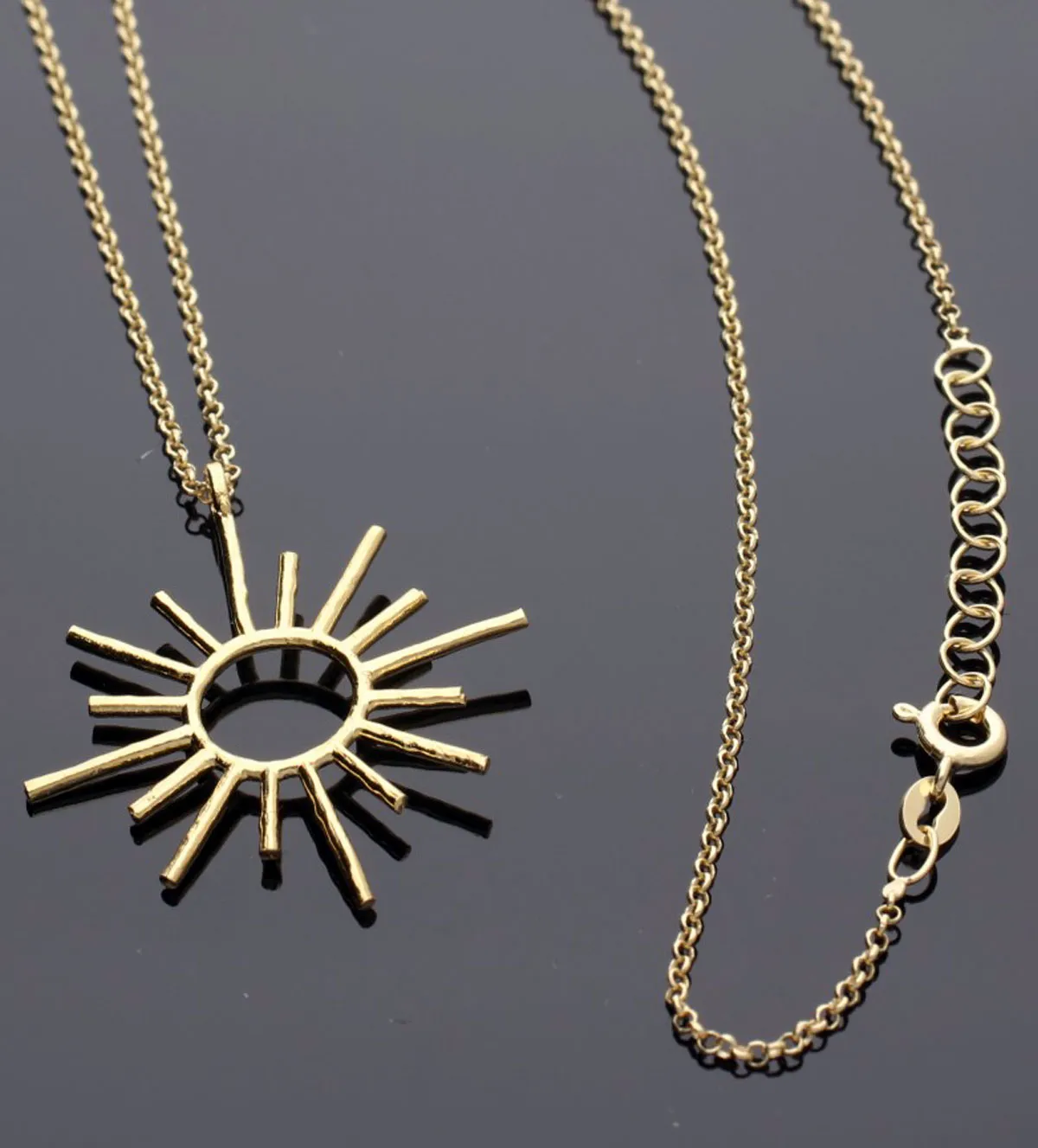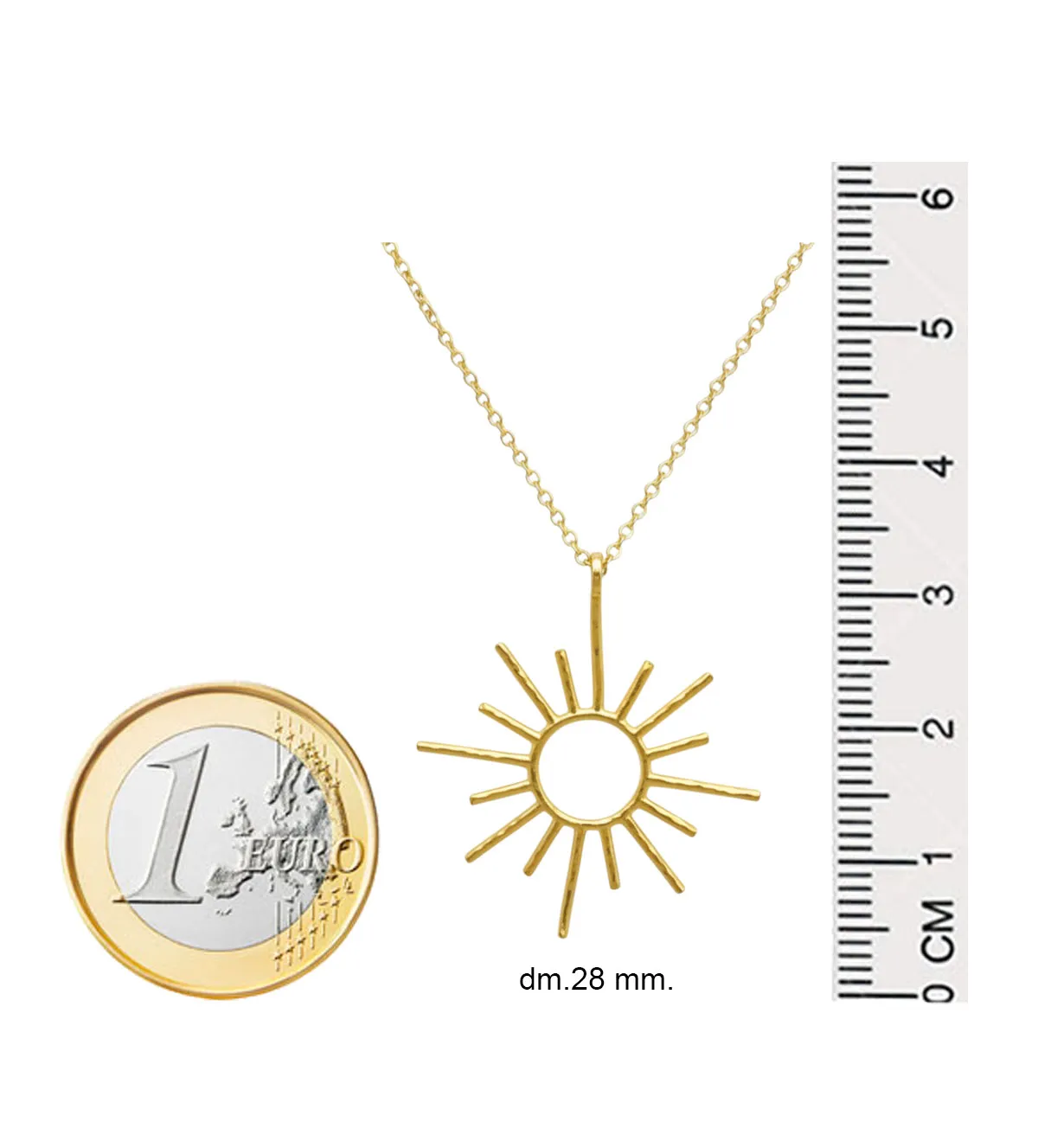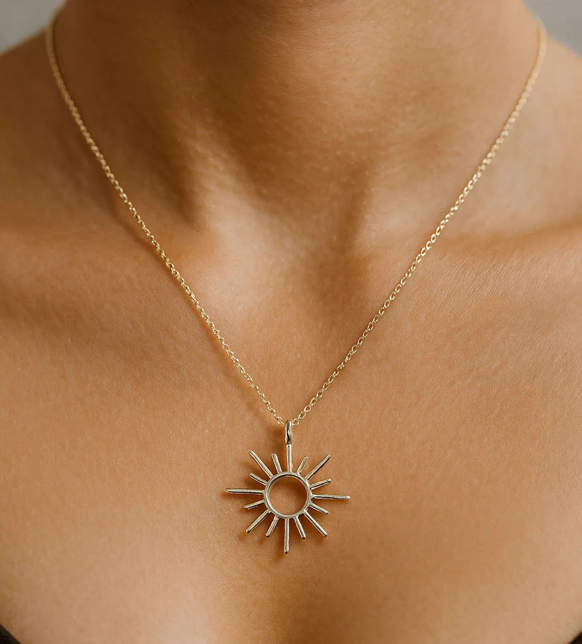El sol es un símbolo universal de energía, vida y renovación, por lo que esta gargantilla no solo embellece, sino que también transmite un mensaje profundo. Llevar un motivo solar puede asociarse con optimismo, fuerza interior, claridad y protección.