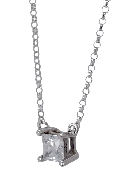 Gargantilla de plata formada por una cadena fina de eslabones tipo rolo y un colgante de circonita de talla princesa engastada en garra, la cadena dispone de un cierre de seguridad tipo reasa, se trata de un bonito diseño que siempre queda bien y nunca pasa de moda y puedes acompañarlo con los pendientes a juego que también encontraras en nuestra tienda.