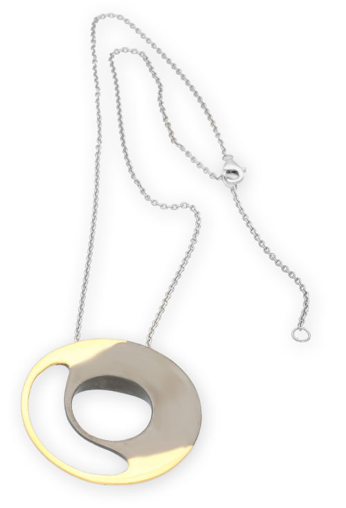 Gargantilla de plata bicolor con diseño circular, con cadena de eslabón forzado en color plata y motivo chapado en color oro y rutenio que le otorga un color ennegrecido característico del rutenio, una gargantilla con un toque muy original que siempre gusta como regalo y que acrecienta la belleza de su portadora.