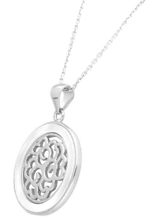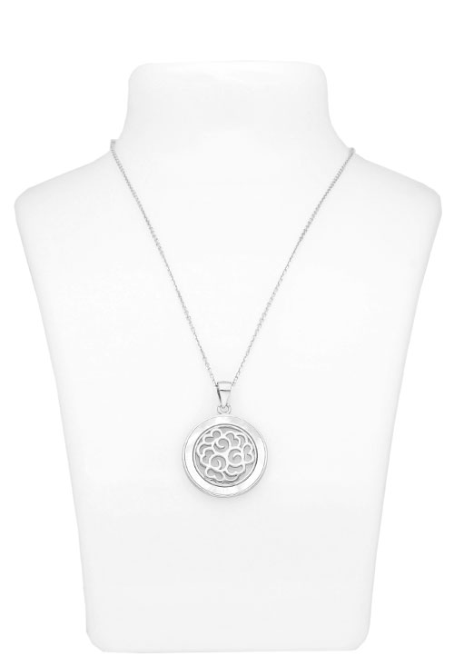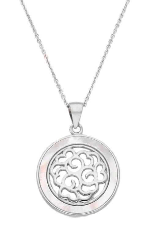 Gargantilla plata cadena forzada de la que cuelga un precioso y romantico colgante de forma circular con calados arabescos rodeados por un bisel de nácar, y que se cuelga de un asa de escudo, un precioso regalo para no olvidar un momento especial.
