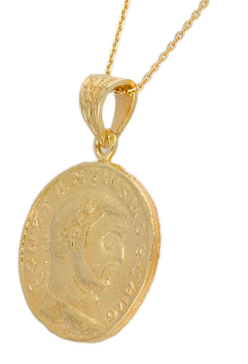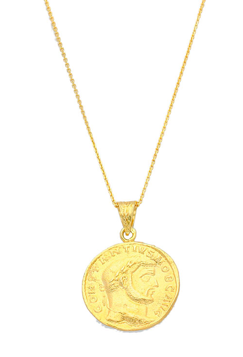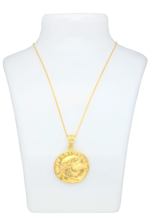 Gargantilla plata chapada moneda antigua, motivo reproduciendo una moneda antigua que esta realizada en plata con asa de escudo colgando de una cadena fina con eslabones forzados y cierre de reasa, todo el conjunto esta chapado en oro amarillo y es una gargantilla perfecta para lucir en las ocasiones más diferentes, perfecto regalo para dejar un recuerdo con el que siempre te recordaran.