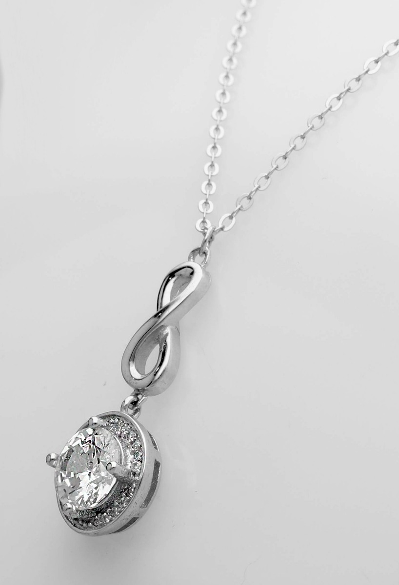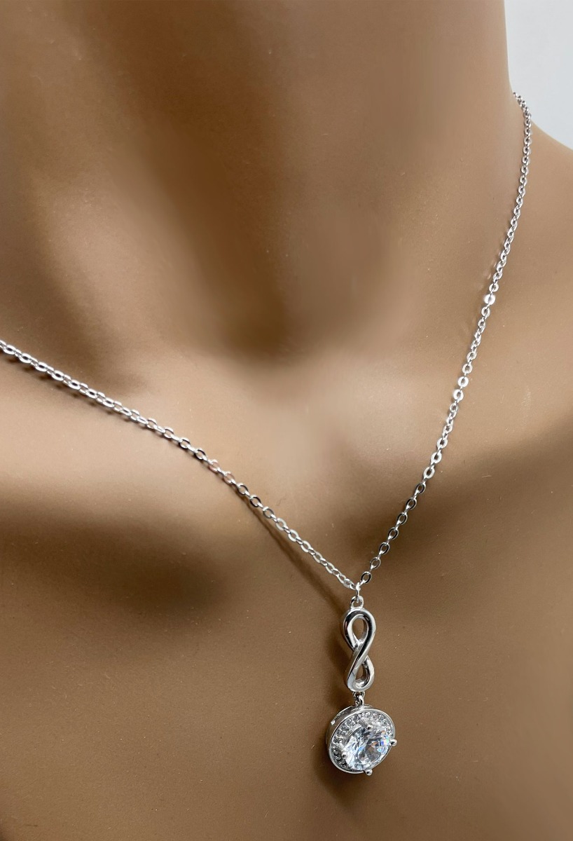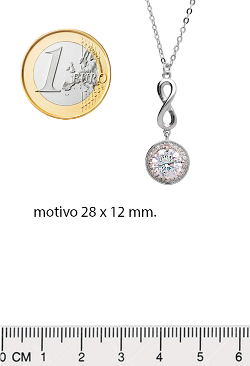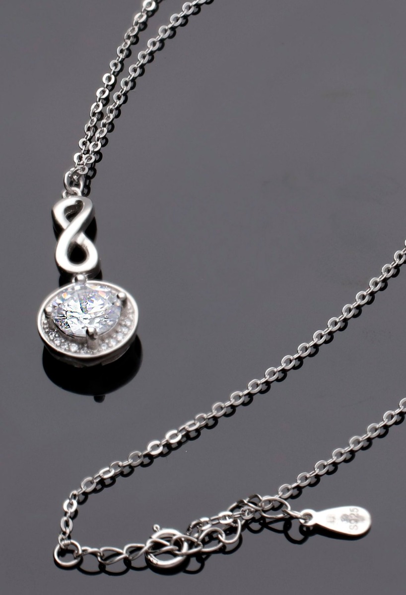 Gargantilla plata motivos símbolo de infinito y colgante con gran circonita, cadena fina de eslabones con cierre de seguridad tipo reasa de la que cuelga un precioso motivo en forma de símbolo de infinito y motivo circular con gran circonita orlada por circonitas más pequeños, este motivo simboliza lo eterno y es un clásico regalo de enamorados, es toda una declaración de intenciones, símbolo del amor eterno.