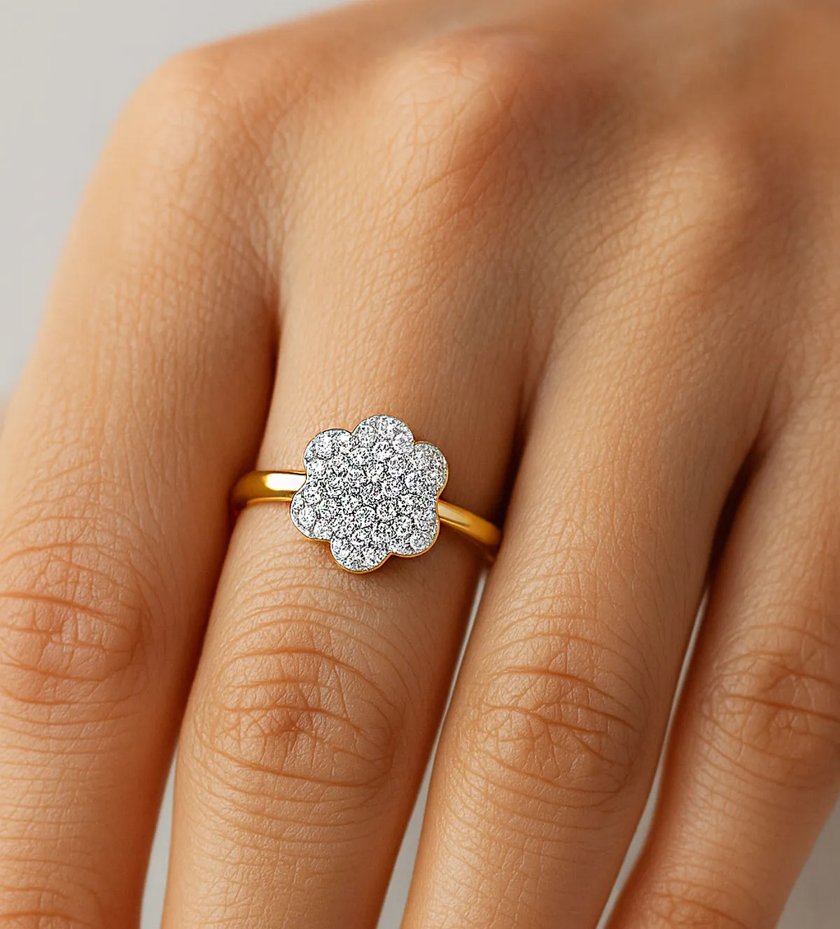 Conjunto de oro bicolor 18 kilates con diseño floral cuajado de circonitas sobre base de oro amarillo. Incluye pendientes con cierre omega, sortija y colgante con asa de escudo. Una joya elegante y femenina, ideal para realzar tu estilo en cualquier ocasión y destacar con un brillo atemporal. ¡Hazlo tuyo hoy mismo, pocas unidades disponibles en stock con entrega inmediata!