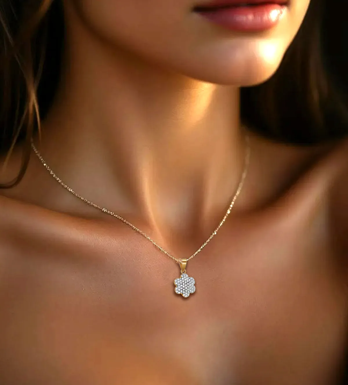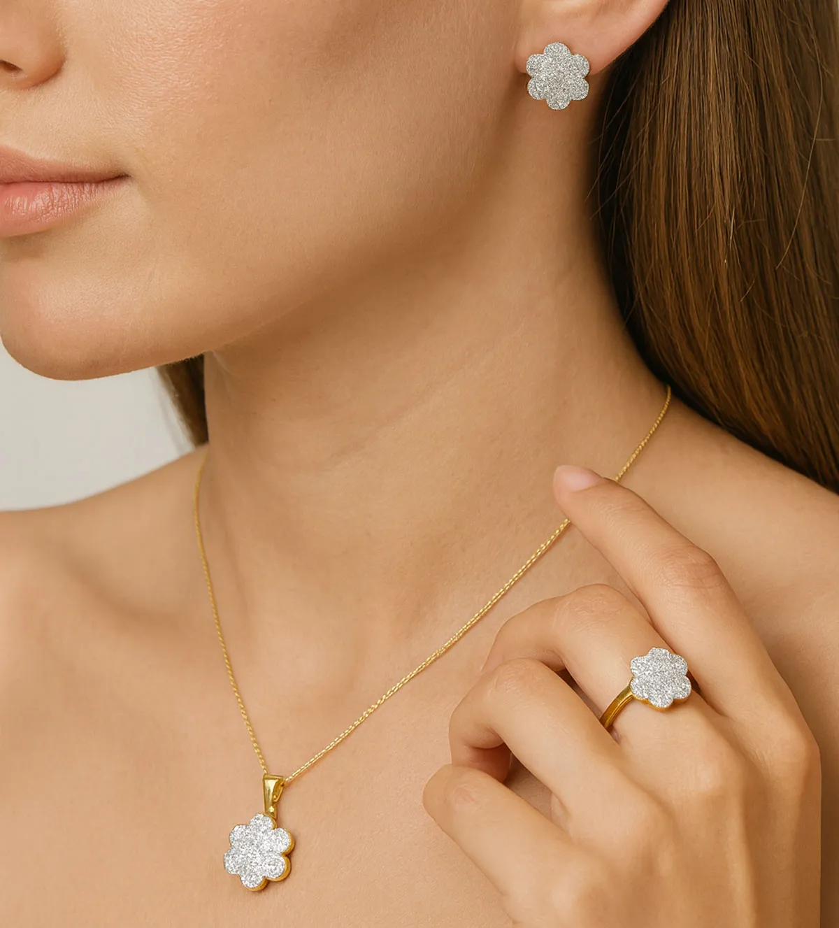 La flor es un símbolo universal de belleza, armonía y renovación. En este conjunto, la flor de seis pétalos con circonitas resalta la feminidad y transmite energía positiva. Las circonitas, asociadas con la luz y la pureza, añaden un valor emocional extra, convirtiendo la joya en mucho más que un simple adorno.