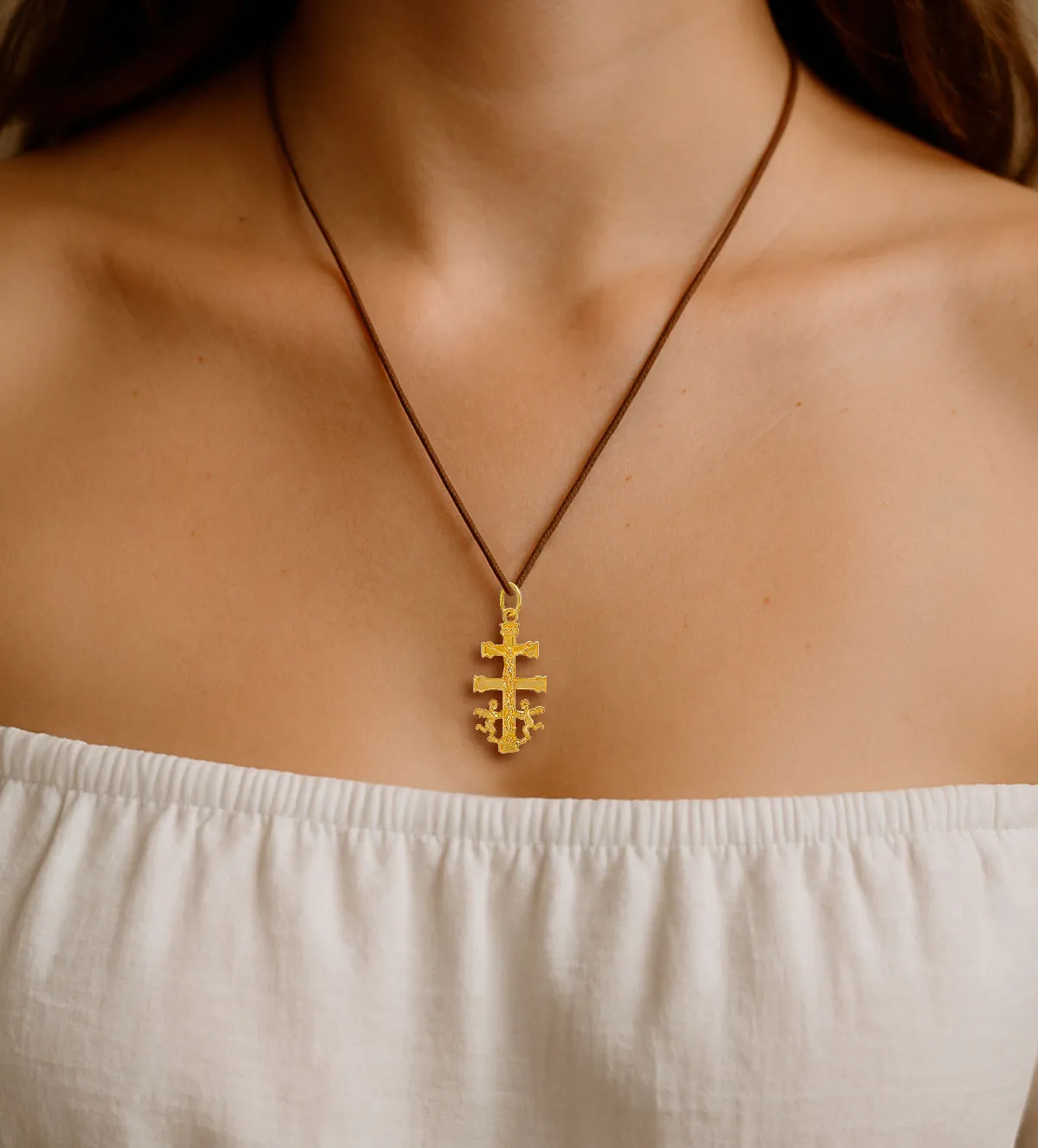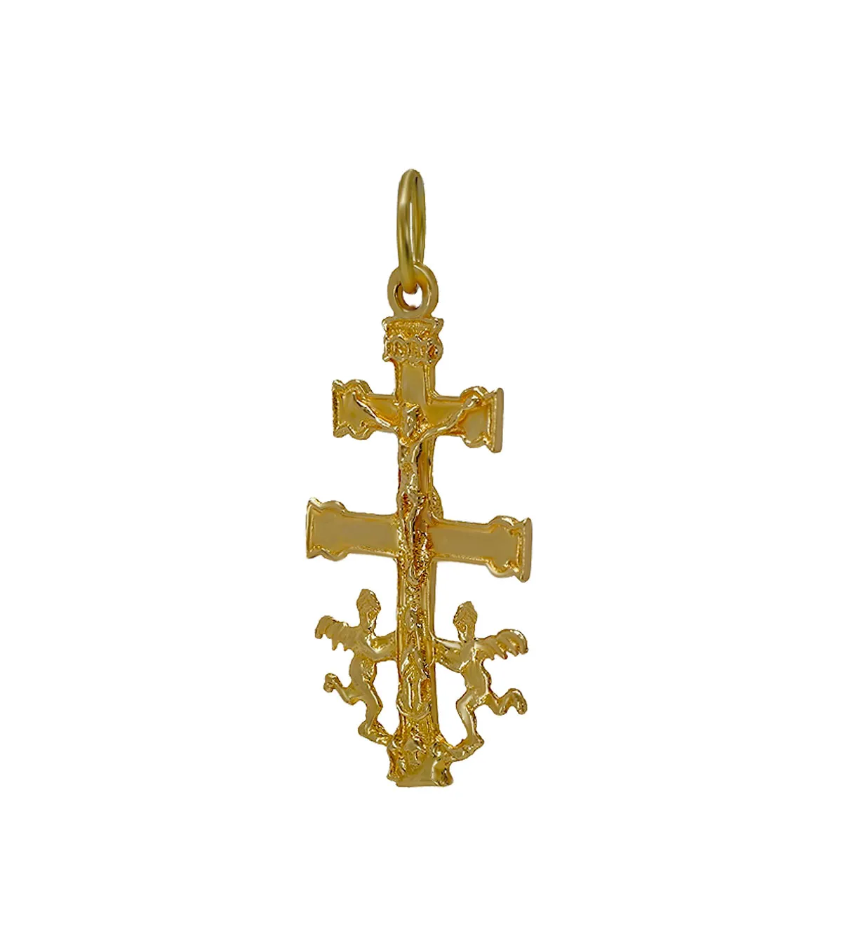 La Cruz de Caravaca tiene sus orígenes en la ciudad murciana del mismo nombre, donde se venera desde hace siglos. Su historia está envuelta en leyendas milagrosas que la vinculan con apariciones divinas y poder espiritual. Los dos brazos horizontales representan la jerarquía celestial, y los ángeles en la base simbolizan la presencia constante de lo divino en la vida humana. Esta cruz de oro no es solo una joya, sino también un símbolo protector profundamente arraigado en la fe cristiana.