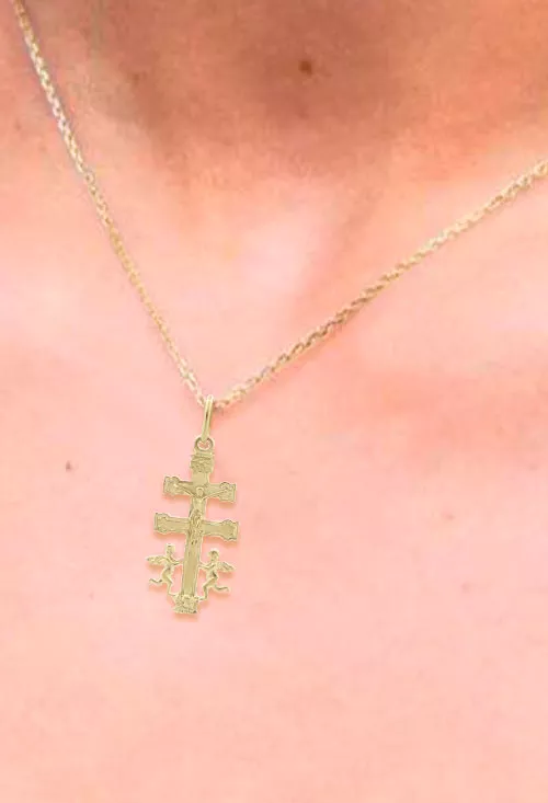 La cruz de Caravaca tiene un profundo significado dentro de la tradición católica. Originaria de la ciudad de Caravaca de la Cruz, en España, esta cruz es un símbolo de fe, protección y milagros. La leyenda cuenta que esta cruz apareció milagrosamente en el siglo XIII, convirtiéndose en un poderoso símbolo de devoción. Los dos brazos horizontales de la cruz representan la unión entre lo divino y lo terrenal, y se cree que quienes la llevan están bajo una especial protección divina. Llevar esta cruz no solo es un acto de fe, sino también un vínculo con una tradición que ha sido venerada durante siglos.