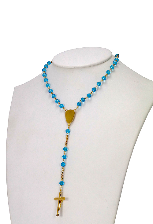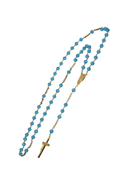 Rosario de oro amarillo 1ª ley 18 kilates con entrepiezas de cuarzos azules, bonita joya religiosa perfecto regalo de primera Comunión para niña, la cruz de este rosario tiene un tamaño de 17×19 milímetros, el peso es de 18,40 gramos y el largo total es de 72 centímetros.