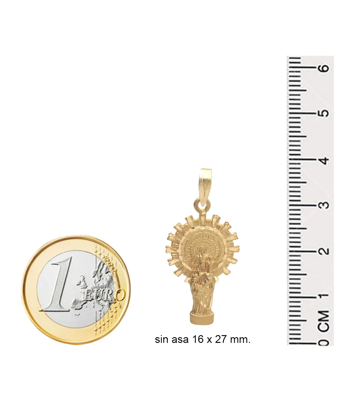 El trabajo artesanal en esta medalla de oro es excepcional. Su diseño silueteado permite una representación delicada y refinada de la Virgen del Pilar, mientras que los cortes lapidados crean un efecto de destellos que resaltan la figura sagrada. Su asa de escudo proporciona una sujeción segura y resistente, ideal para usar con cadenas de distintos grosores.
