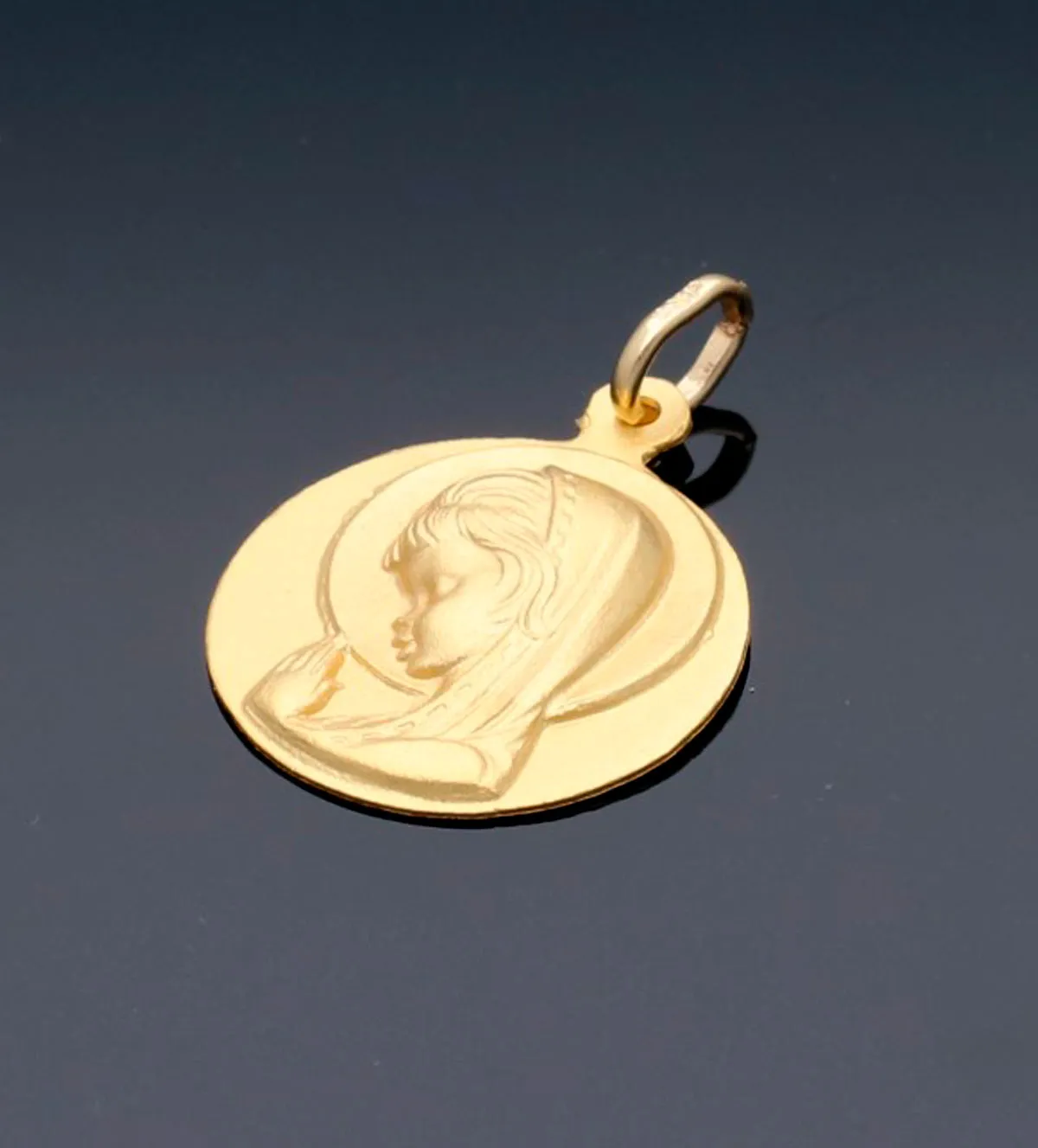 Medalla de oro virgen niña en acabado mate opaco, una joya delicada y significativa. Con la imagen de una niña rezando de perfil, esta medalla es ideal como regalo de fe y ternura. Puede grabarse en el reverso para personalizarla. Consulta disponibilidad en distintas medidas. ¡Últimas unidades en stock y envío inmediato!