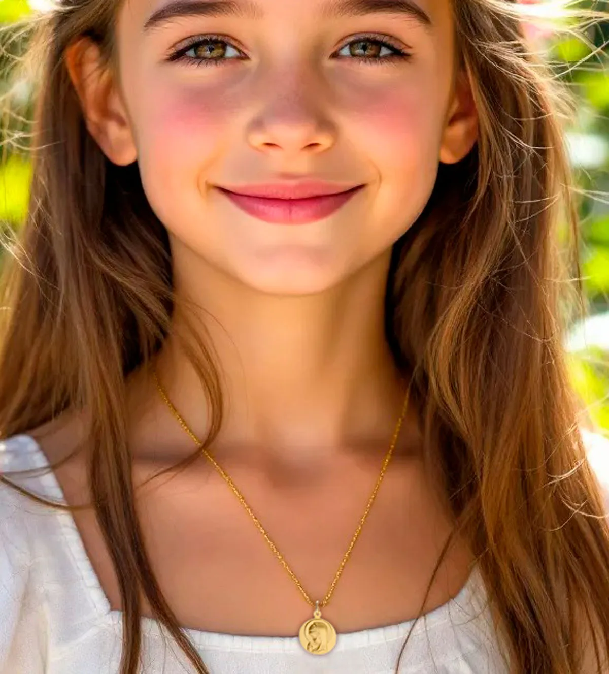 Medalla de oro virgen niña: símbolo de fe y ternura con opción de grabado personalizado