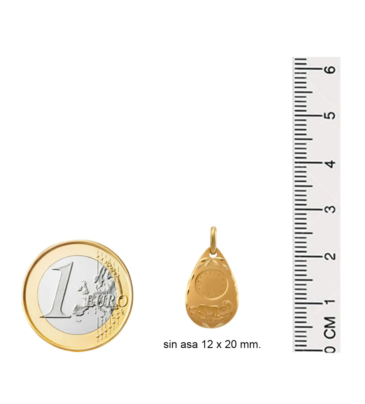 La medalla mide 12 x 20 mm sin contar el asa y tiene un peso aproximado de 1,50 gramos. Su tamaño equilibrado y su ligereza la hacen ideal para bebés, niños o incluso adultos que deseen llevarla como recuerdo emocional. Puede combinarse con cadenas finas o cintas de tela, según la edad y el estilo deseado.