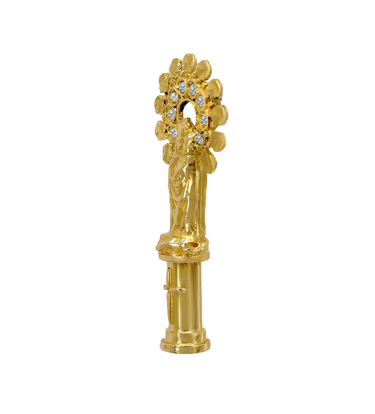 Medalla de oro de 18K representando a la Virgen del Pilar en impactante diseño 3D, con áurea adornada con circonitas y un asa trasera oculta para un acabado elegante. Una joya exclusiva y poco vista, perfecta como regalo único y recuerdo inolvidable. Disponible en stock con entrega inmediata. ¡Consigue esta medalla de oro hoy y luce una pieza llena de significado!