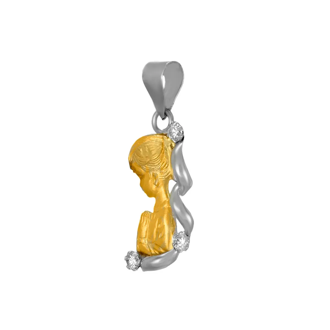 El diseño representa a la Virgen Niña rezando, una figura profundamente emotiva y cargada de significado espiritual. Esta delicada silueta en oro amarillo se destaca gracias al marco semicircular de plata con tres circonitas engastadas en garra, que además de aportar belleza, brindan un toque de modernidad.