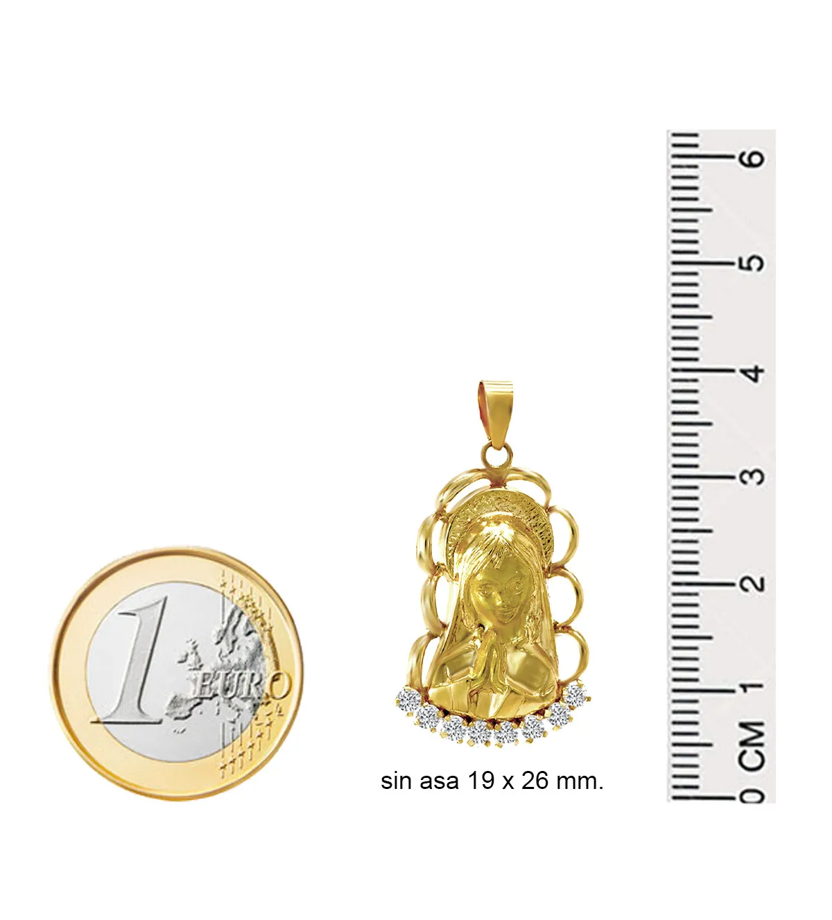 El diseño de esta medalla de oro es una obra de arte en miniatura. Representa la silueta de la Virgen Niña en delicado alto relieve, rodeada por una orla calada en forma de ondas que aporta suavidad y dinamismo al diseño. La base que sostiene la imagen está formada por ocho circonitas, estratégicamente distribuidas para reflejar la luz y resaltar cada contorno de la medalla.