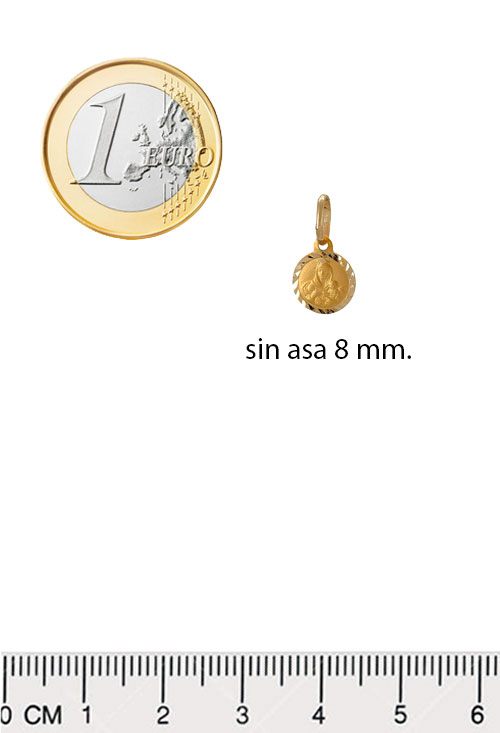 Medalla religiosa escapulario de oro amarillo 18 kilates tamaño lenteja con la representación de la Virgen del Carmen por una cara y el Sagrado Corazón por la opuesta, acabado mate con bisel brillo lapidado, esta medalla que por su pequeño tamaño se denomina coloquialmente como lenteja mide solo 8 mm. de diámetro y se utiliza para colgar de las cadenillas de seguridad aunque también puede utilizarse como colgante.