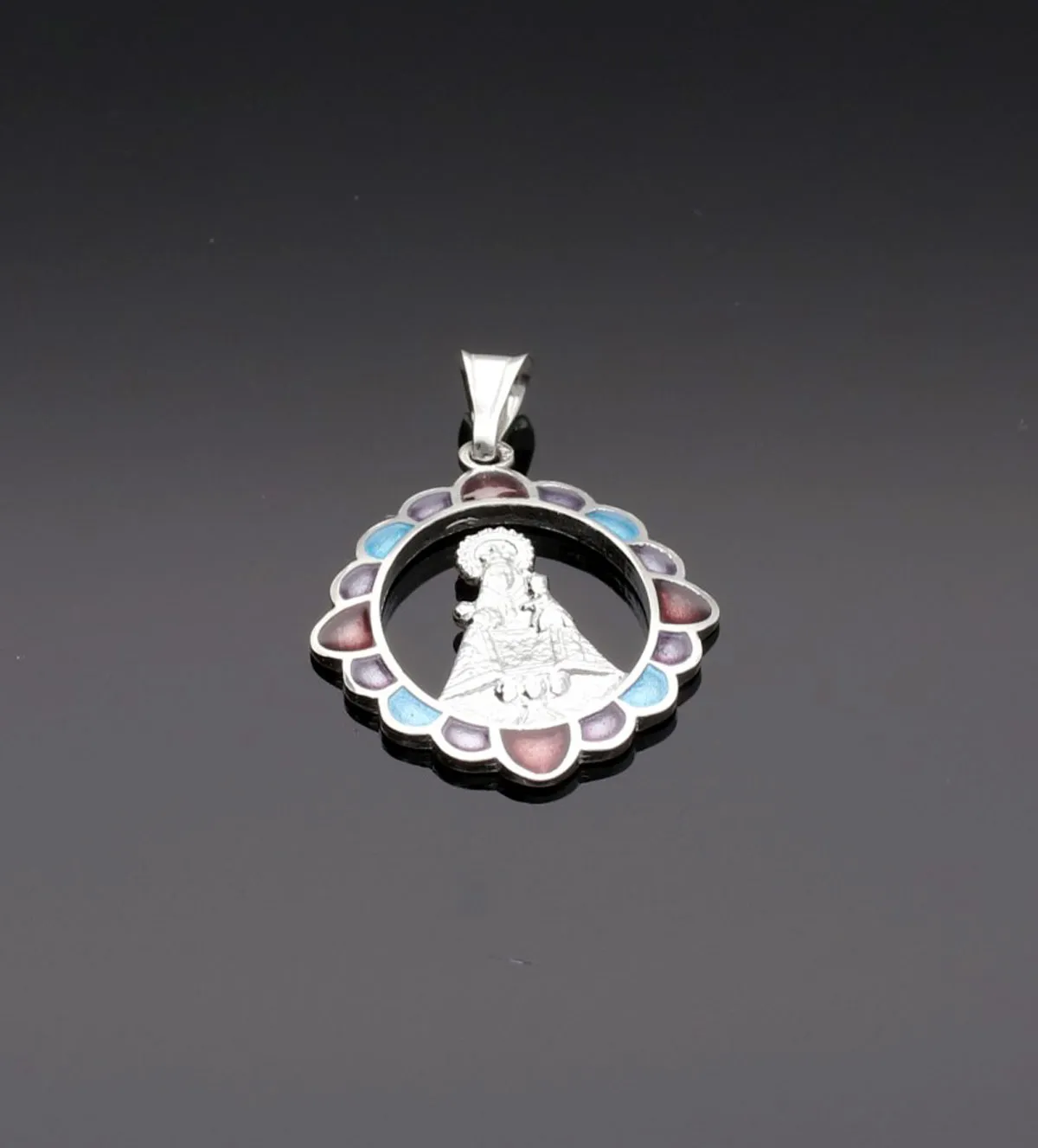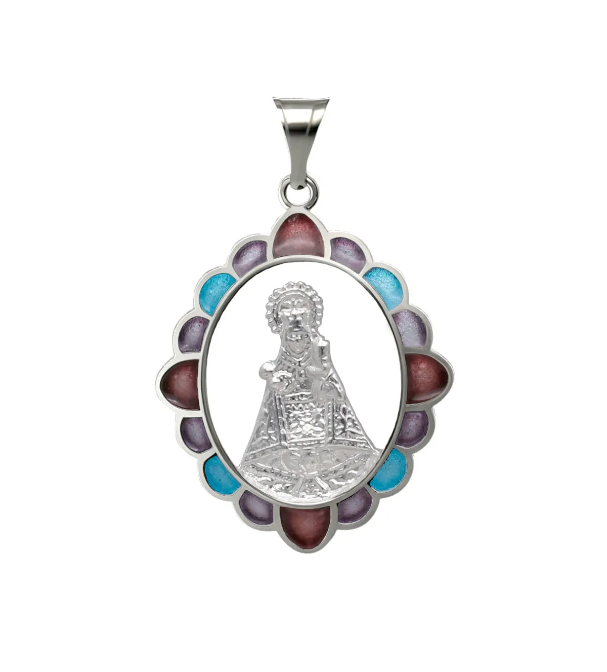 - ¿El diseño es exclusivo? Sí, esta medalla presenta un diseño original de la silueta de la Virgen de Covadonga rodeada de esmaltes multicolores.