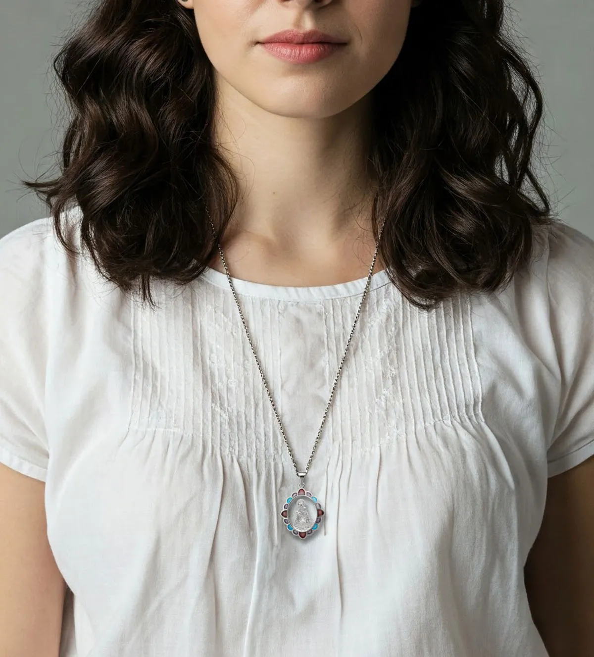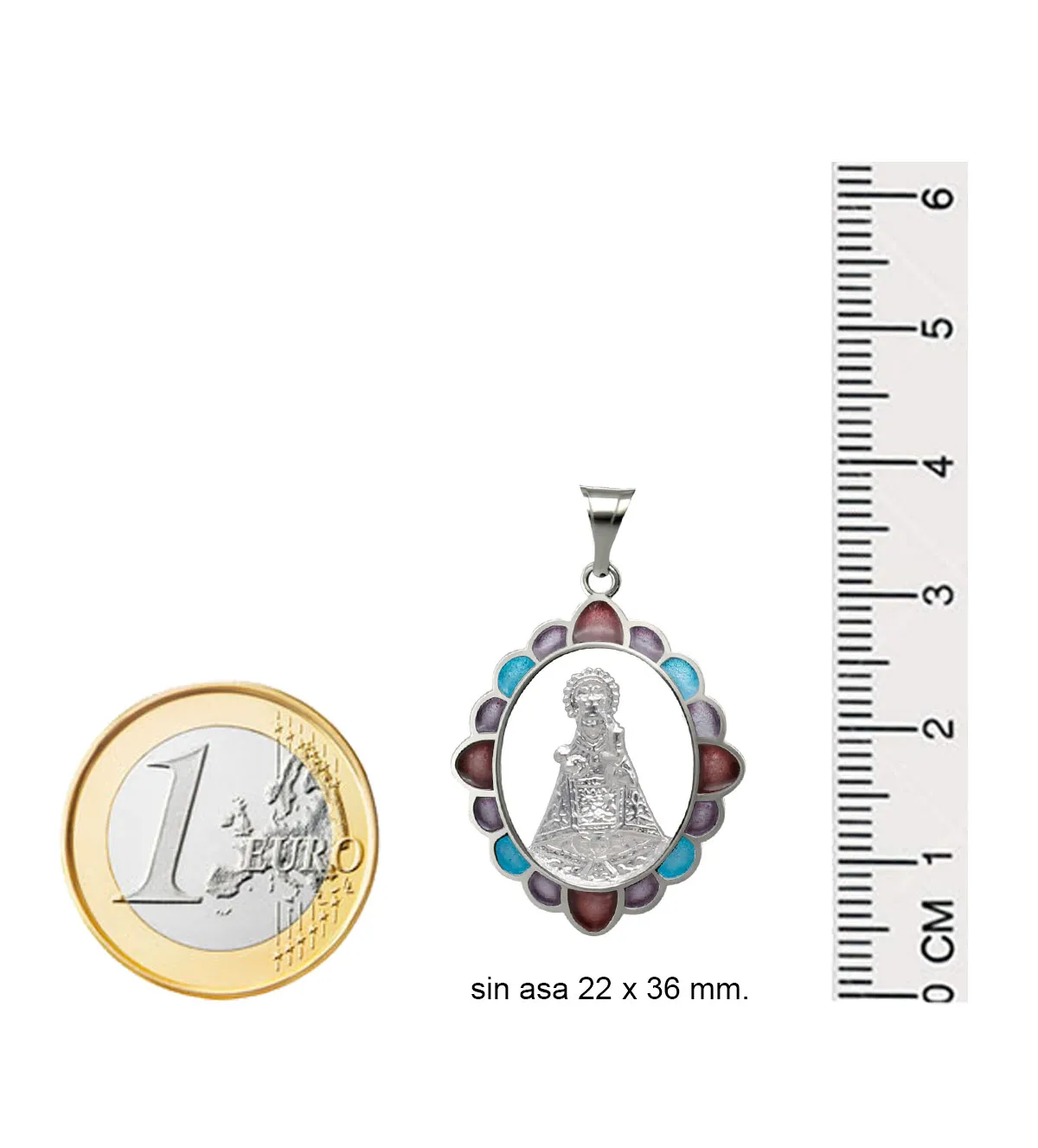 Con unas medidas de 22×26 milímetros (sin incluir el asa) y un peso aproximado de 3 gramos, esta medalla de plata tiene un tamaño ideal para ser llevada cómodamente en el día a día. Su peso ligero asegura que no resulte incómoda, mientras que sus dimensiones permiten apreciar la belleza del diseño y la intensidad de los colores del esmalte. Es una joya que se adapta perfectamente al cuello, convirtiéndose en un símbolo personal de fe y estilo.