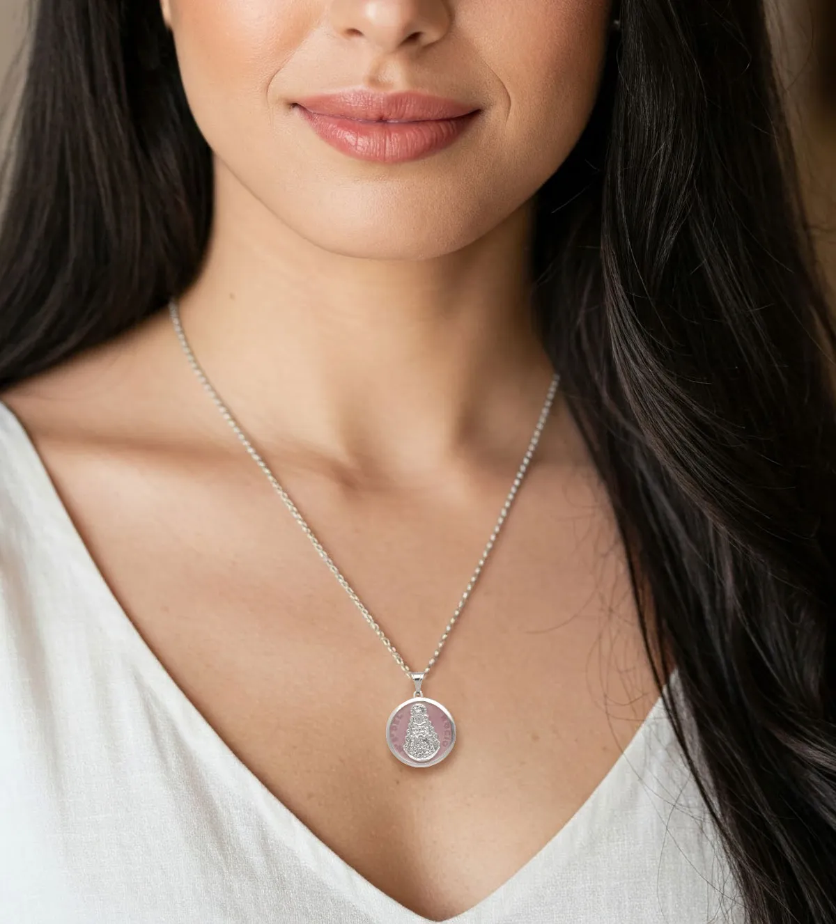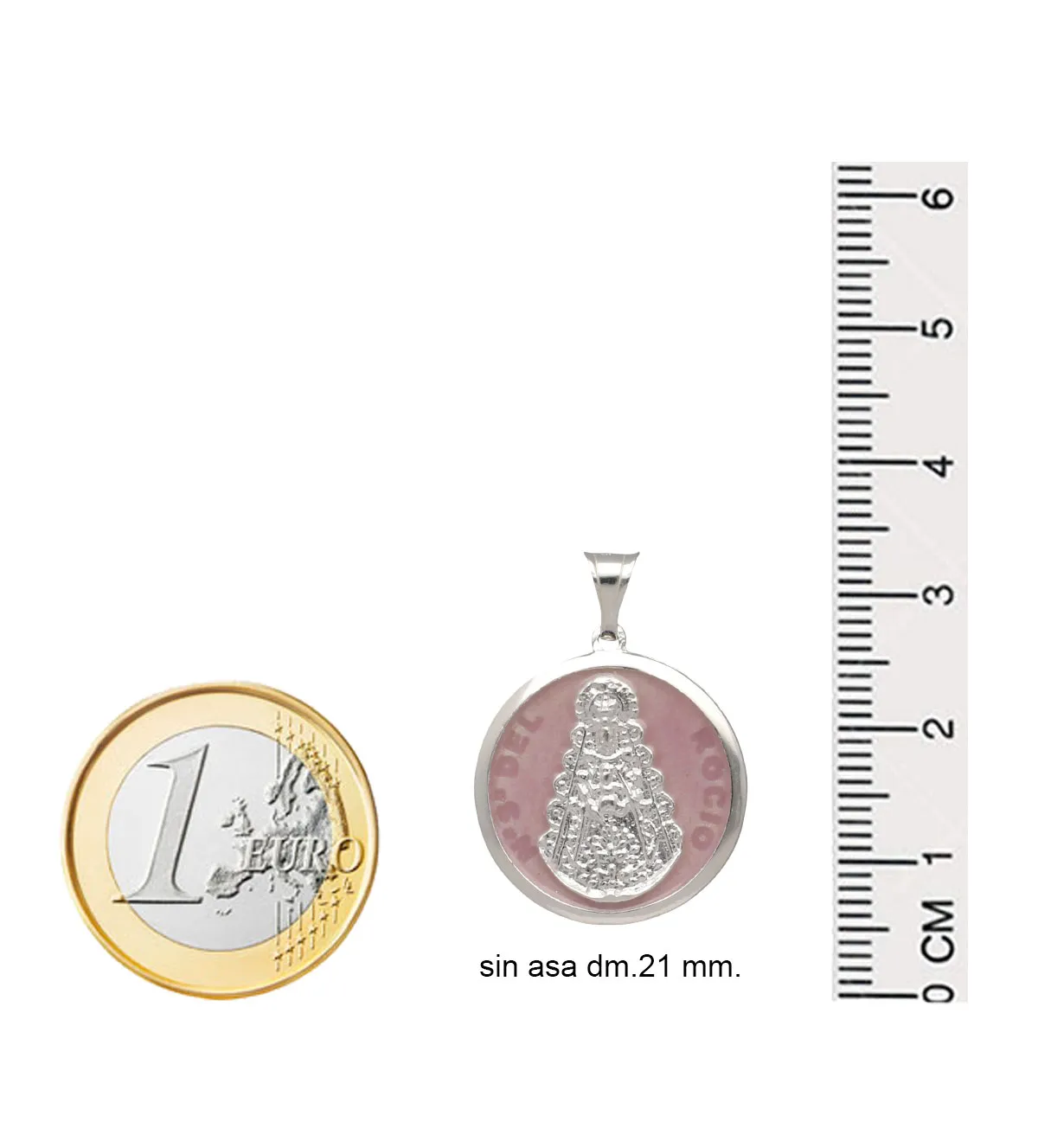 Elaborada en plata de ley 925, esta medalla de plata cuenta con un acabado impecable que resalta cada detalle de la figura de la Virgen. El toque de color lo aporta el esmalte a fuego en tono rosa, aplicado cuidadosamente mediante técnicas artesanales que aseguran durabilidad y belleza.