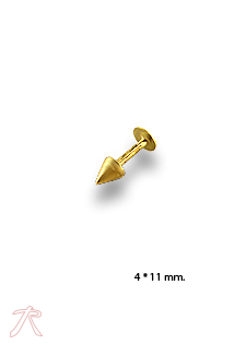 Piercing oro para labio o lengua tanto para mujer como para hombre, no provoca rechazo al estar completamente hecho en oro amarillo de primera ley u oro de 18 quilates. extremos plano y en forma de cono con una longitud de 11 milímetros y una anchura en la parte más ancha del cono de 4 milímetros este piercing tiene un peso en oro de 0.50 gramos y puedes comprar con un descuento especial para venta online.
