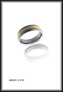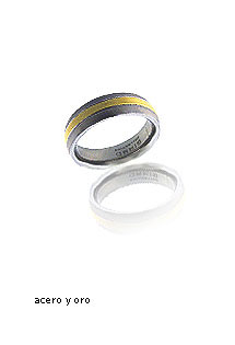 Alianza de acero bicolor, formato de 6 mm. de ancho cruzado longitudinalmente por una franja chapada central flanqueada por acero su color. Modelo seleccionado en nuestro outlet de joyería con un descuento real del 50% de descuento.