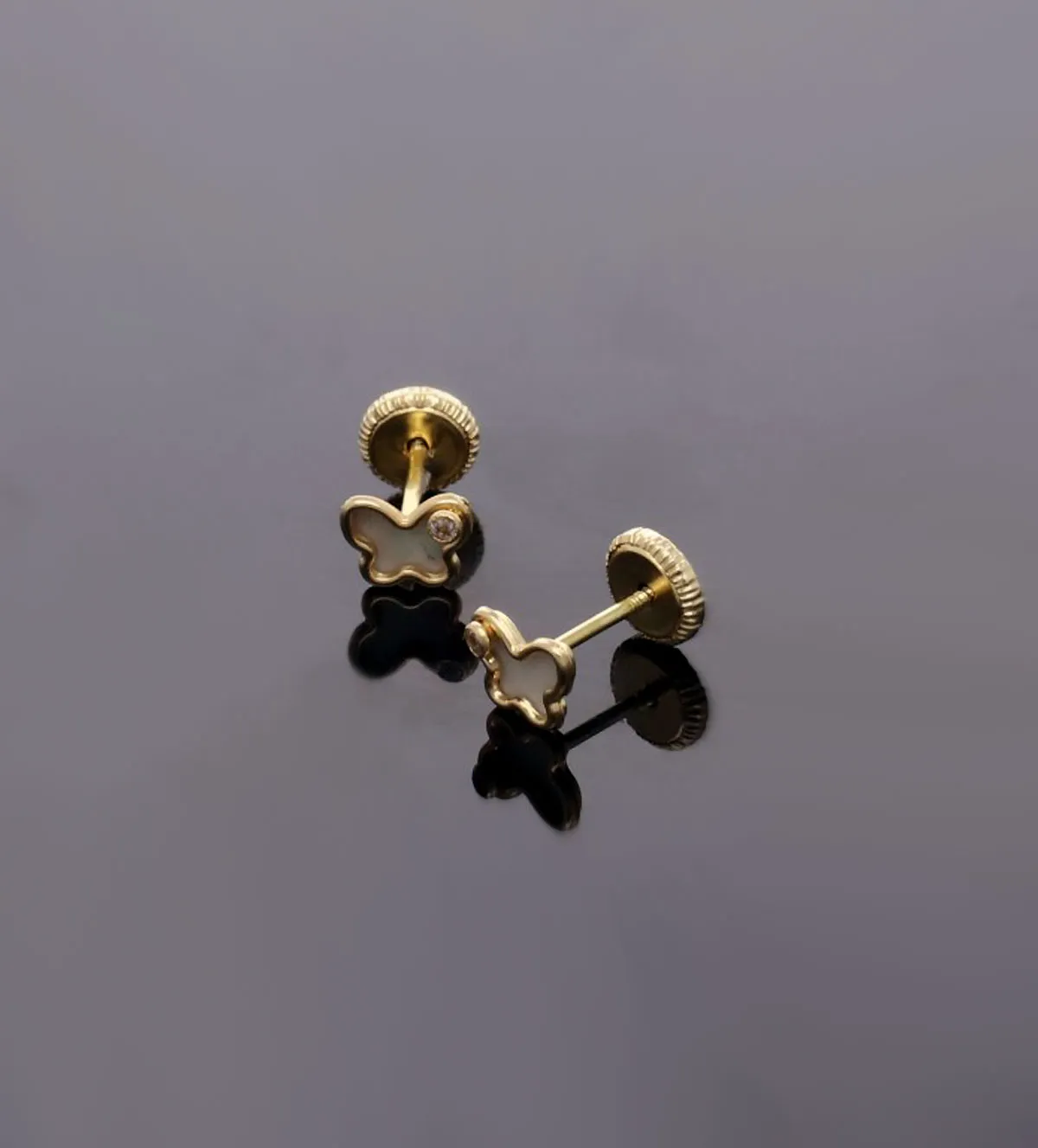 Pendientes de bebé con forma de mariposa, circonita y fondo de nácar: delicadeza y seguridad en cada detalle