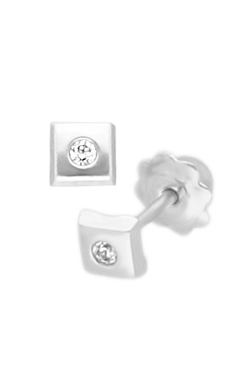 Pendientes de oro blanco 18 kilates para bebé, modelo cuadrado con una circonita engastada en el centro, sistemas de tuerca roscada realizada artesanalmente con tope, un pendiente indicado para la recien nacida, un bonito regalo que ademas puedes comprar muy baratos en nuestra joyería online.