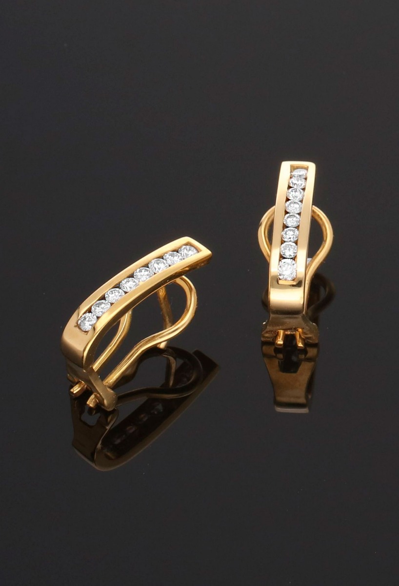 Pendientes oro amarillo 18 kilates con diamantes tipo aretes, carril curvo de 8 diamantes talla brillante con sistemas omega, precioso pendiente muy demandado porque por su simplicidad de lineas resulta muy cómodo y combinativo a la vez que muy elegante para poder lucir en situaciones muy variadas desde ocasiones especiales para ir muy elegante a ocasiones casuales y desenfadadas donde aportan un toque alegre pero distintivo.