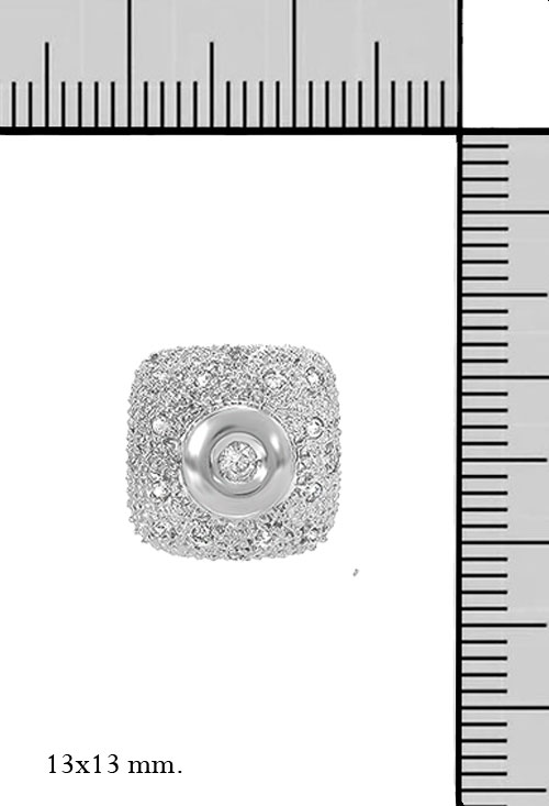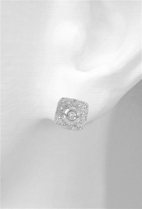Pendientes de oro blanco 18 kilates con diamantes, forma cuadrada bombe con pave de diamantes engastados en grano y una boquilla central con un diamante de mayor tamaño, estos pendientes tienen sistemas de cierre tipo omega, miden 13×13 milímetros y el peso del par de pendientes es de 6,70 gramos entre los dos pendientes lleva un peso en diamantes de 0,61 quilates.