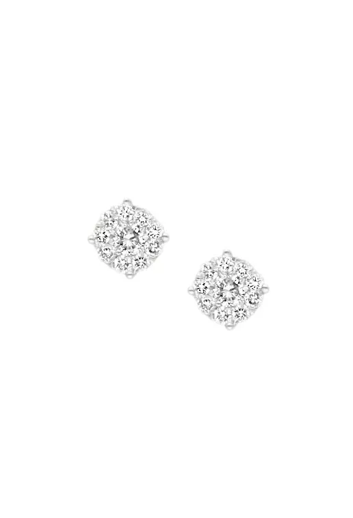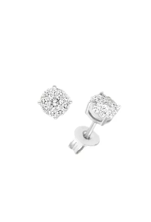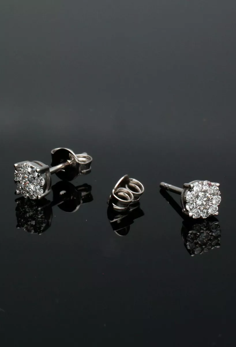 Cada pendiente esta formado por un brillante central de 0,09 quilates rodeado por 9 de menor tamaño que pesan 0,108 quilates todos son color H y pureza SI.