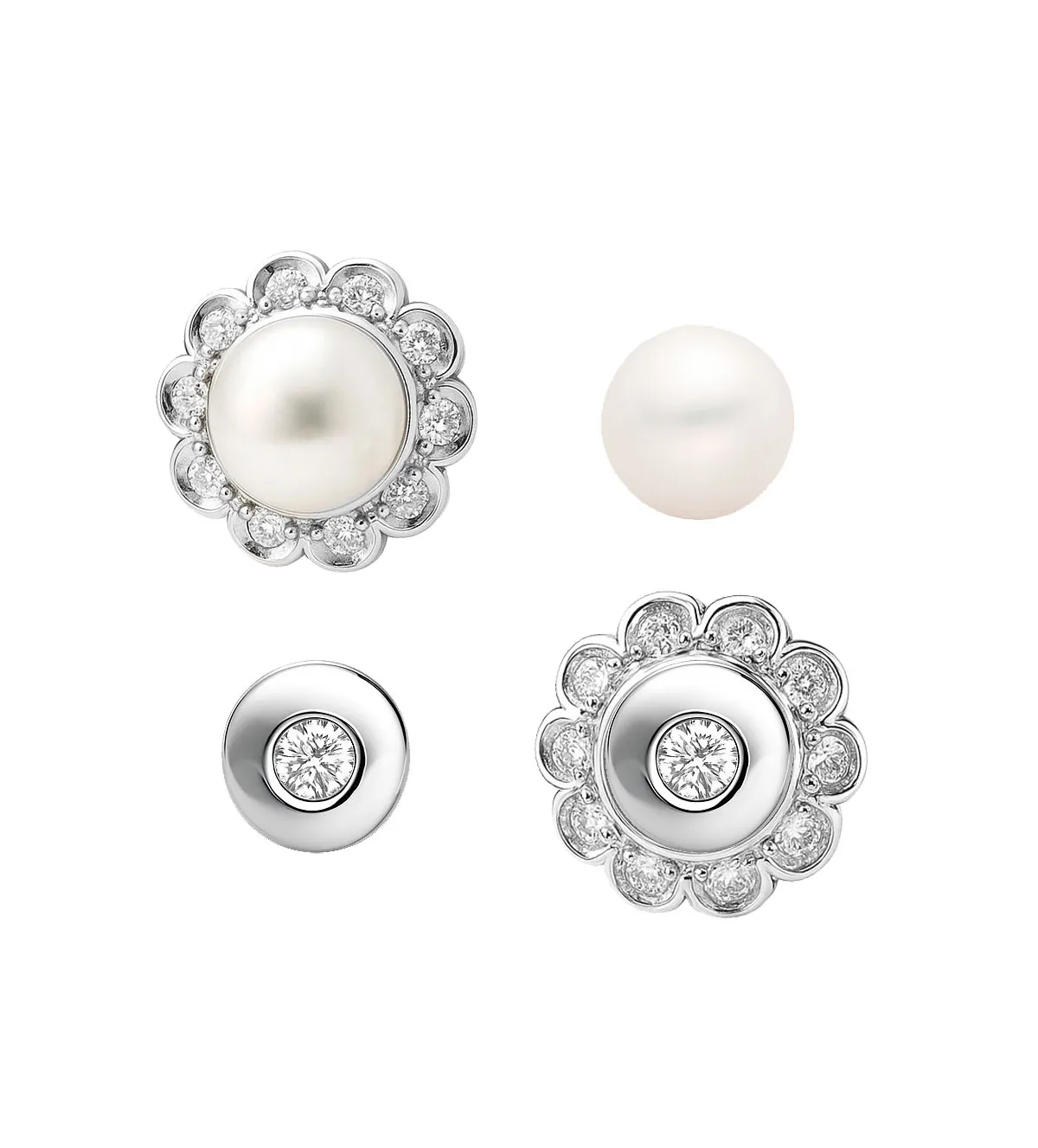 El diseño de estos pendientes de oro blanco ha sido pensado para ofrecer cuatro estilos diferentes en una sola joya. Incluye dos pares de pendientes —uno con perlas cultivadas y otro con chatones de diamantes— junto con dos orlas desmontables que pueden combinarse con ambos modelos.