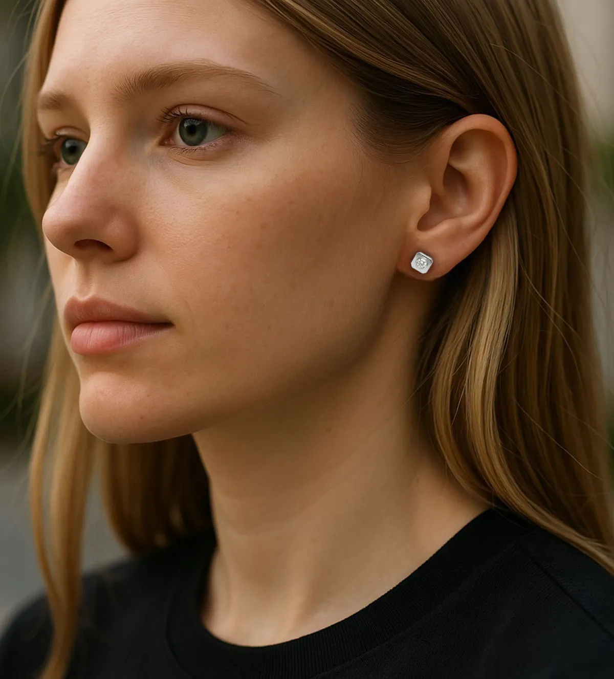 El diseño tipo chatón en forma cuadrada bombe o convexo los diferencia de los pendientes más tradicionales, aportando modernidad y originalidad. Su silueta ligeramente abombada crea un efecto voluminoso y atractivo, mientras que el diamante central ilumina el rostro de manera delicada. Este diseño sobrio y contemporáneo los hace adecuados tanto para hombres como para mujeres, adaptándose a cualquier estilo personal.