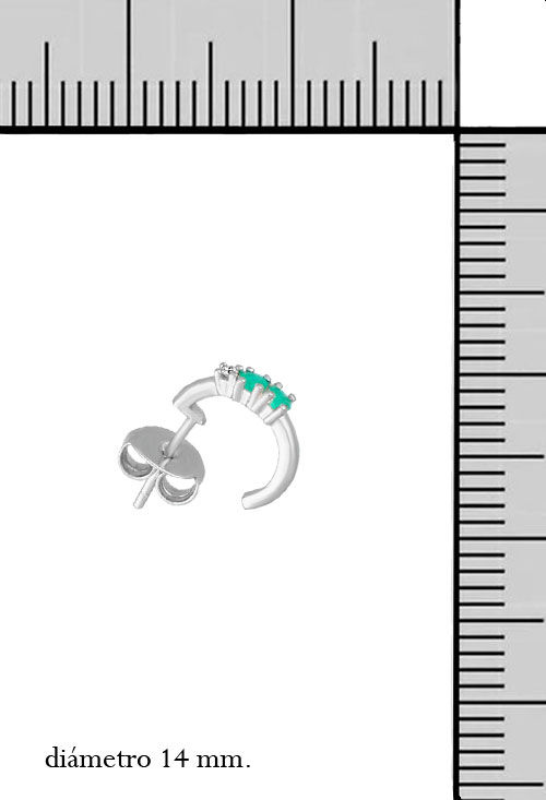 Estos pendientes estilo “criolla” de plata de Ley 925 llevan un diamante natural de calidad Top Wesselton de 1,5 mm. y dos esmeraldas naturales colombianas de 2,5 mm. cada uno.