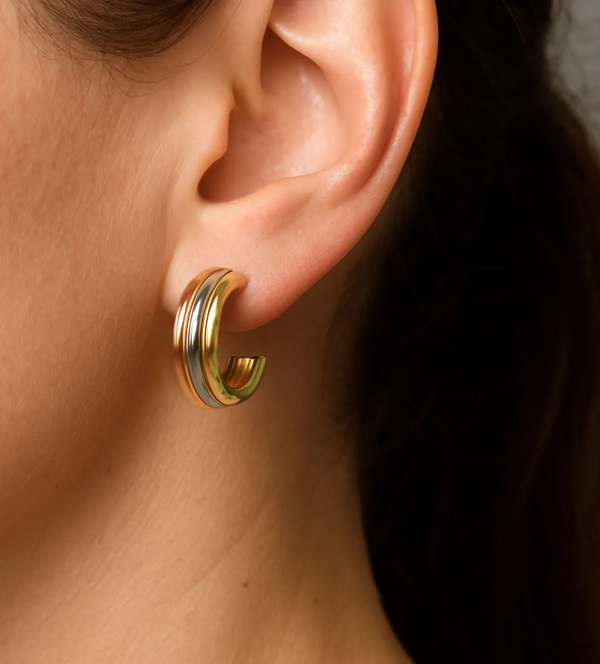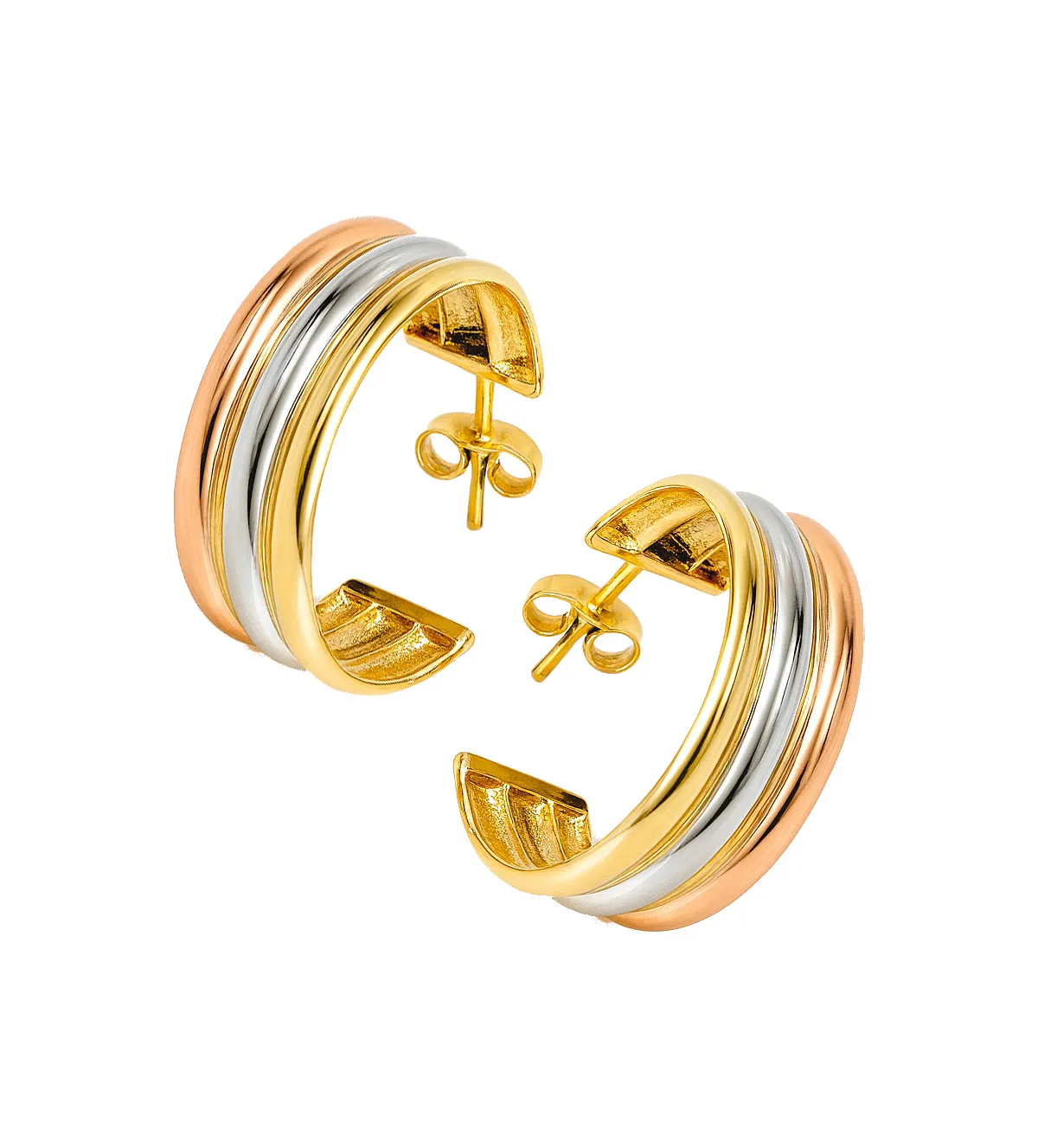 Este estilo tricolor permite que se integren fácilmente con otras joyas, sin importar el tipo de metal que lleves. Su forma de aro aporta un toque clásico, mientras que la disposición de los gallones añade un aire vanguardista que no pasa desapercibido.