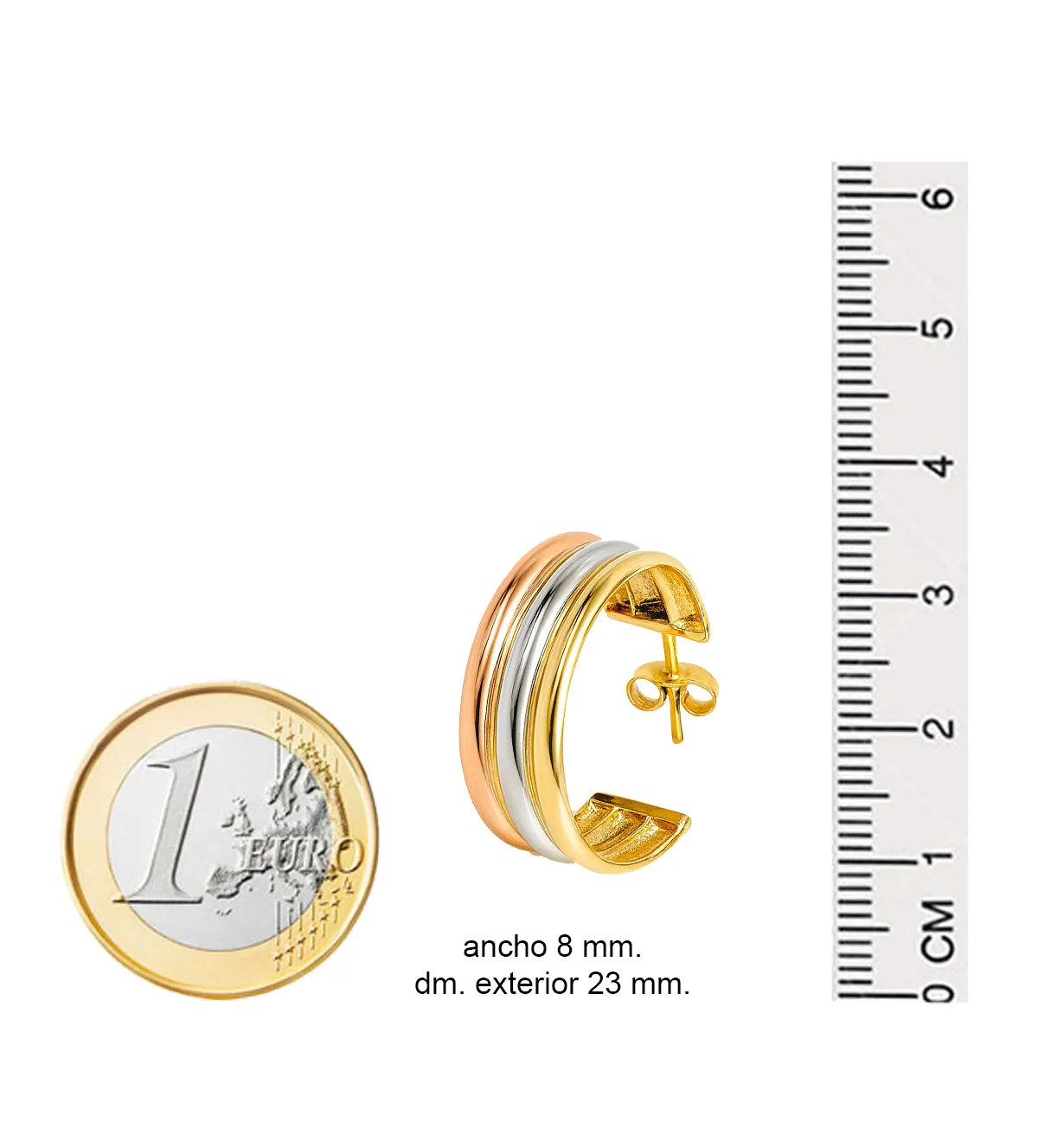 Pendientes de oro con estilo y elegancia desde el primer vistazo. Estos pendientes de oro de 18 ktes. destacan por su diseño de tres gallones paralelos en oro blanco, rosa y amarillo. Una combinación sofisticada, versátil y muy favorecedora que se adapta a cualquier ocasión. Ligeros, cómodos y elegantes, son el complemento ideal para realzar tu estilo diario o de fiesta. ¡Hazte con ellos antes de que se agoten! Disponibilidad inmediata en Rubí Joyeros, la mayor joyería online de España.