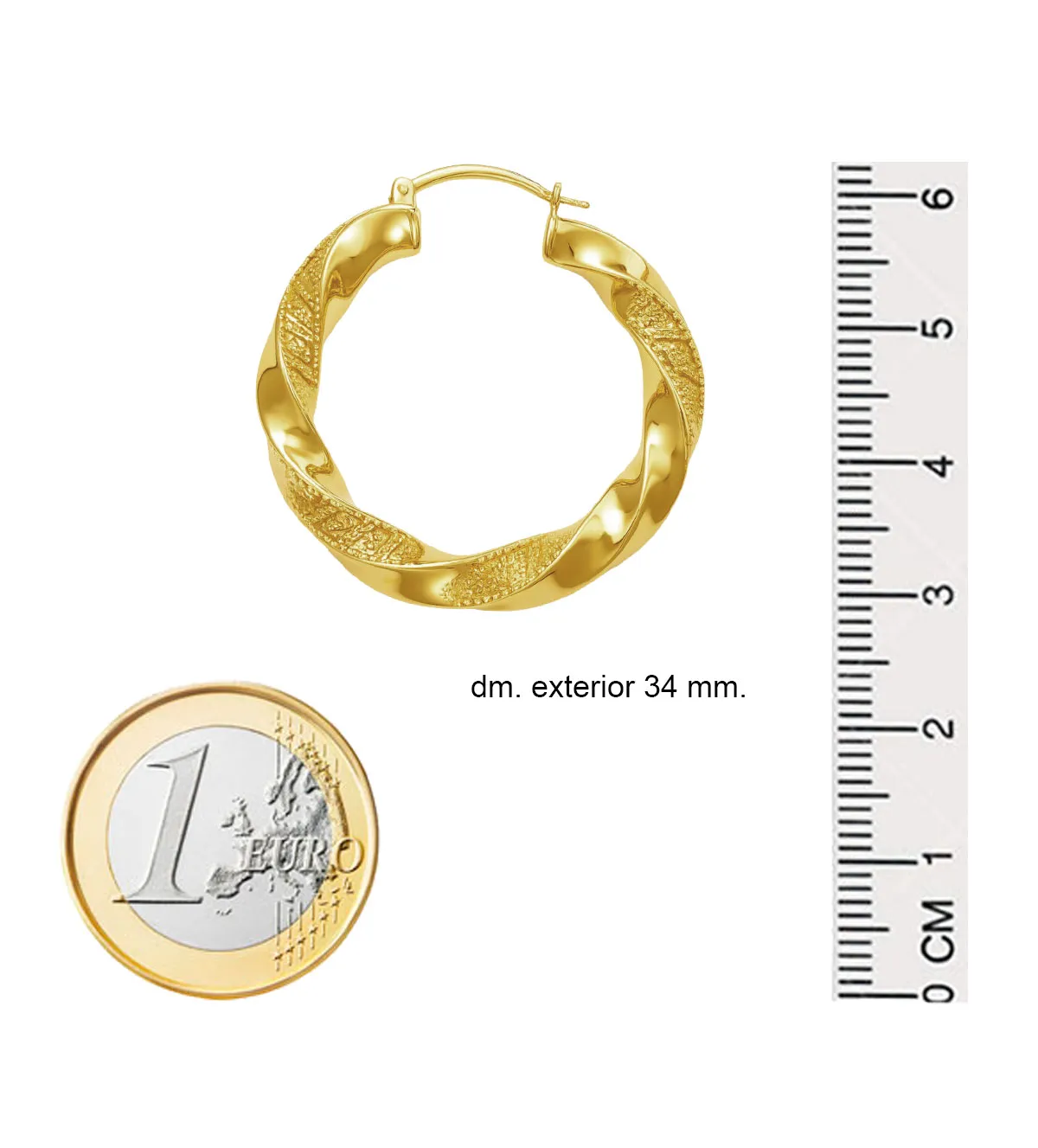 Con un diámetro de 34 mm, estos pendientes ofrecen presencia sin resultar excesivos. El sistema de cierre con ballestilla asegura que puedas ponerlos y quitarlos con facilidad, garantizando al mismo tiempo un ajuste seguro para que los lleves todo el día sin preocupaciones.