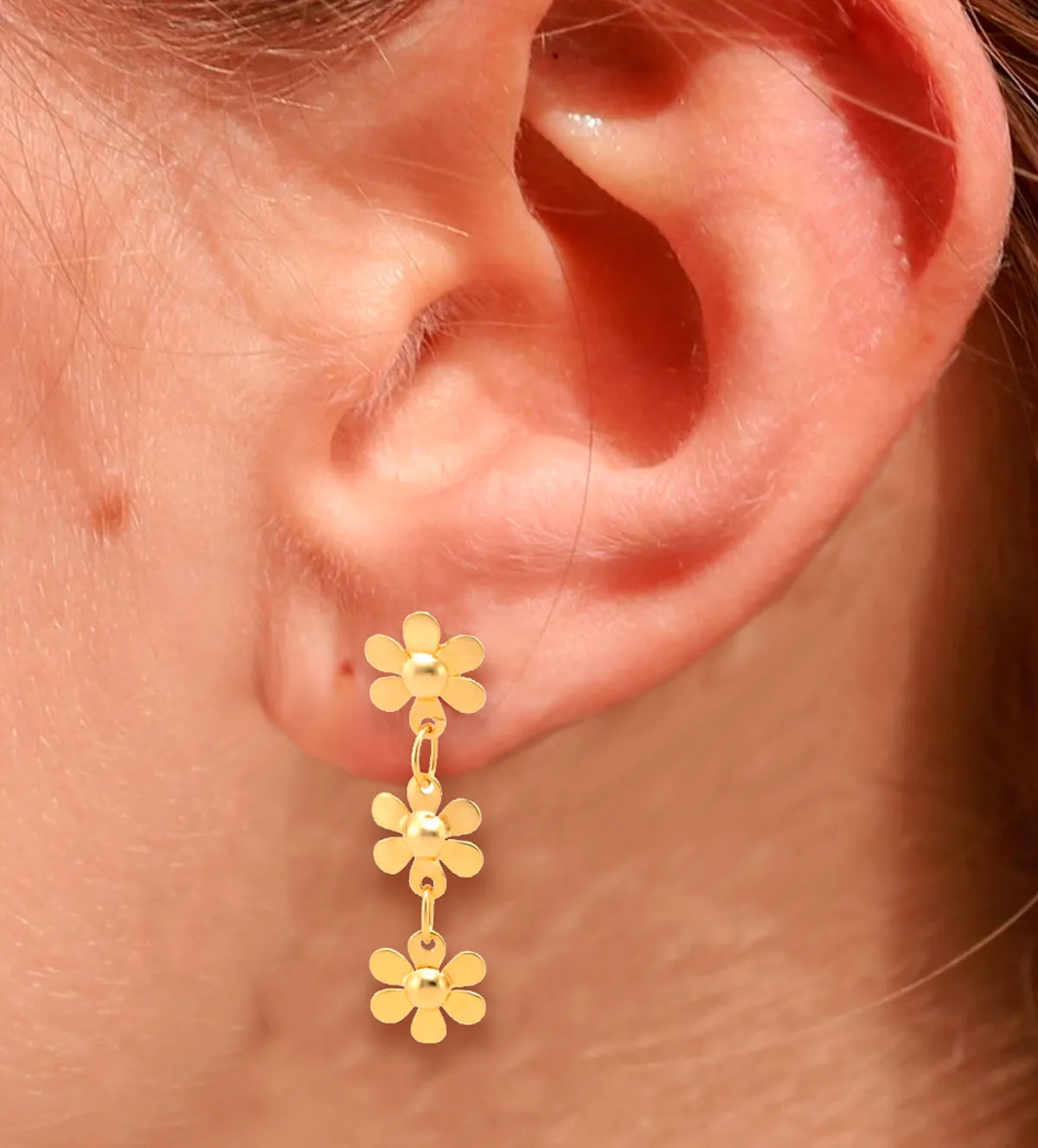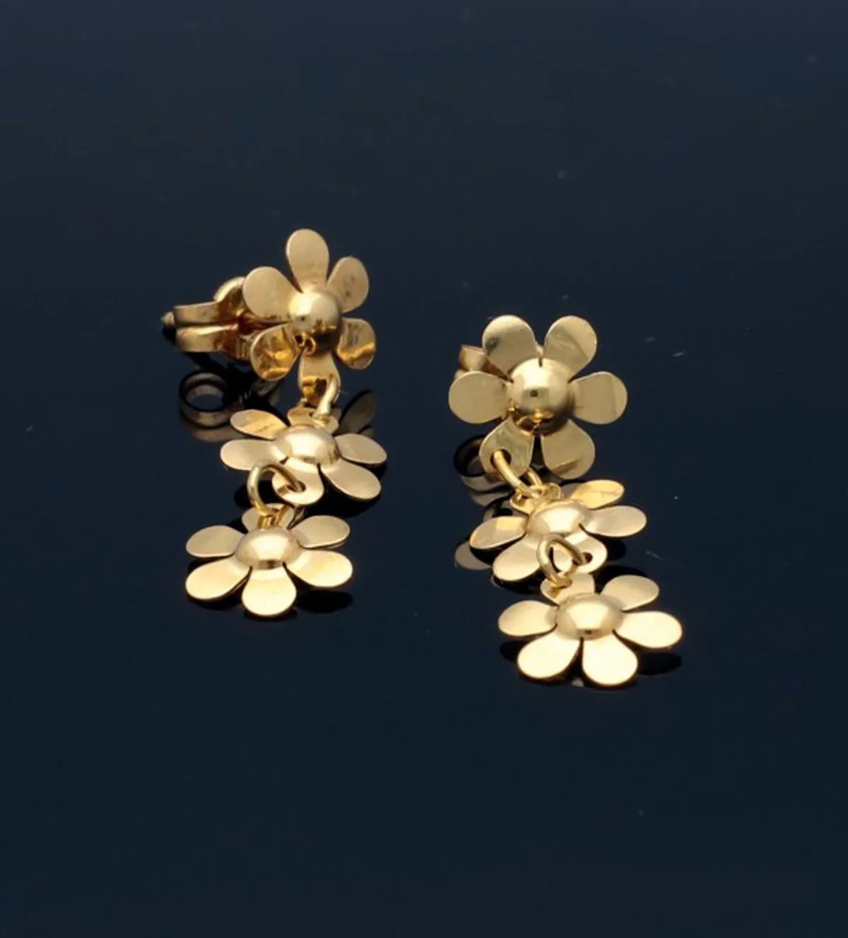 Estos pendientes de oro capturan la esencia de la feminidad y la elegancia natural. Fabricados en oro amarillo de 18 kilates, su diseño está inspirado en la armonía de las flores, con tres margaritas enlazadas que cuelgan con delicadeza, creando un efecto visual refinado y lleno de movimiento.