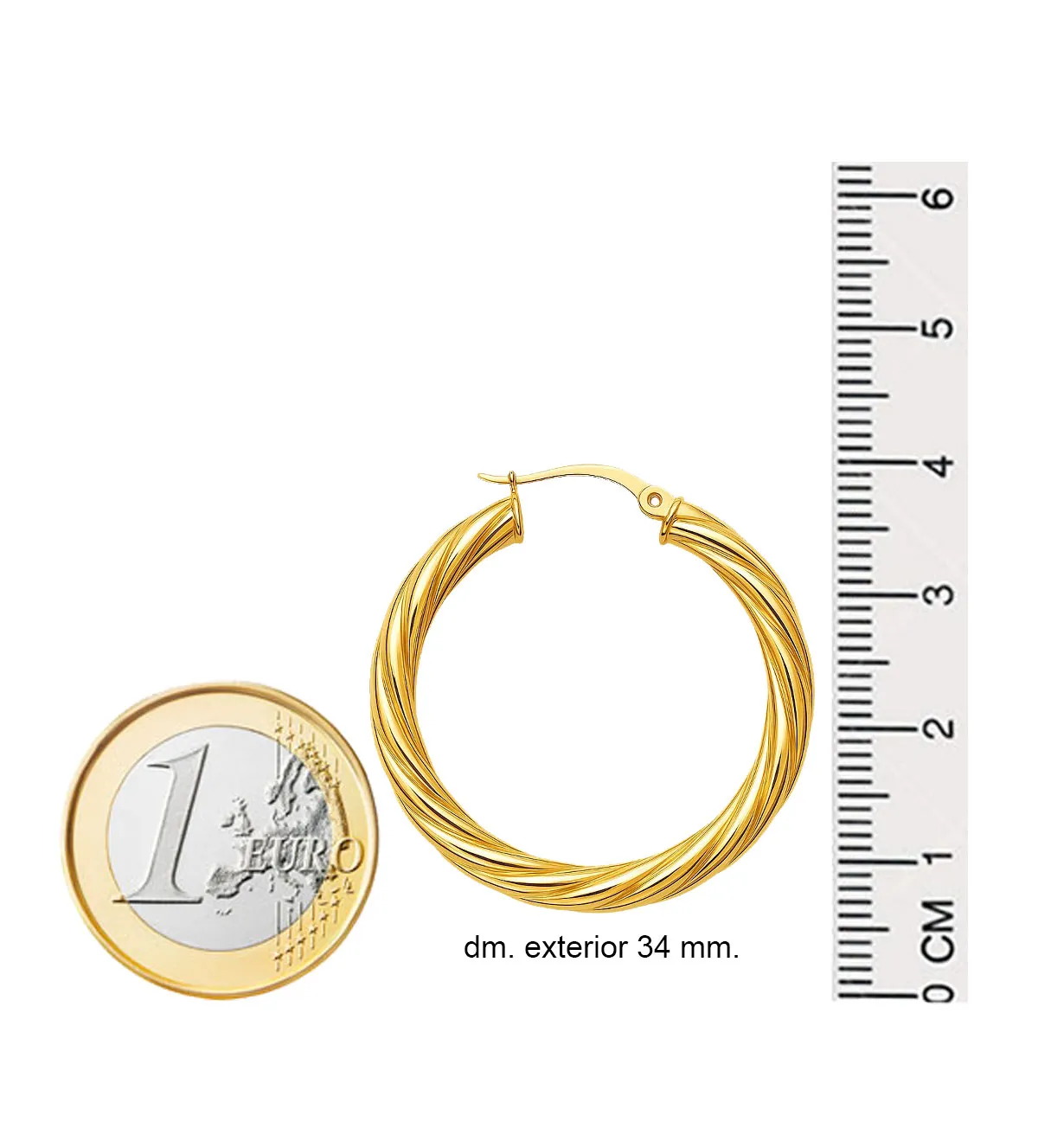 Con sus 34 mm de diámetro, estos pendientes tienen una presencia marcada sin resultar pesados. Su grosor de 2,5 mm proporciona equilibrio entre delicadeza y fuerza visual. Gracias a su cierre en uñeta de U, son fáciles de colocar y muy seguros, evitando aperturas accidentales. Son ligeros y cómodos, ideales para usarlos durante todo el día sin molestias.