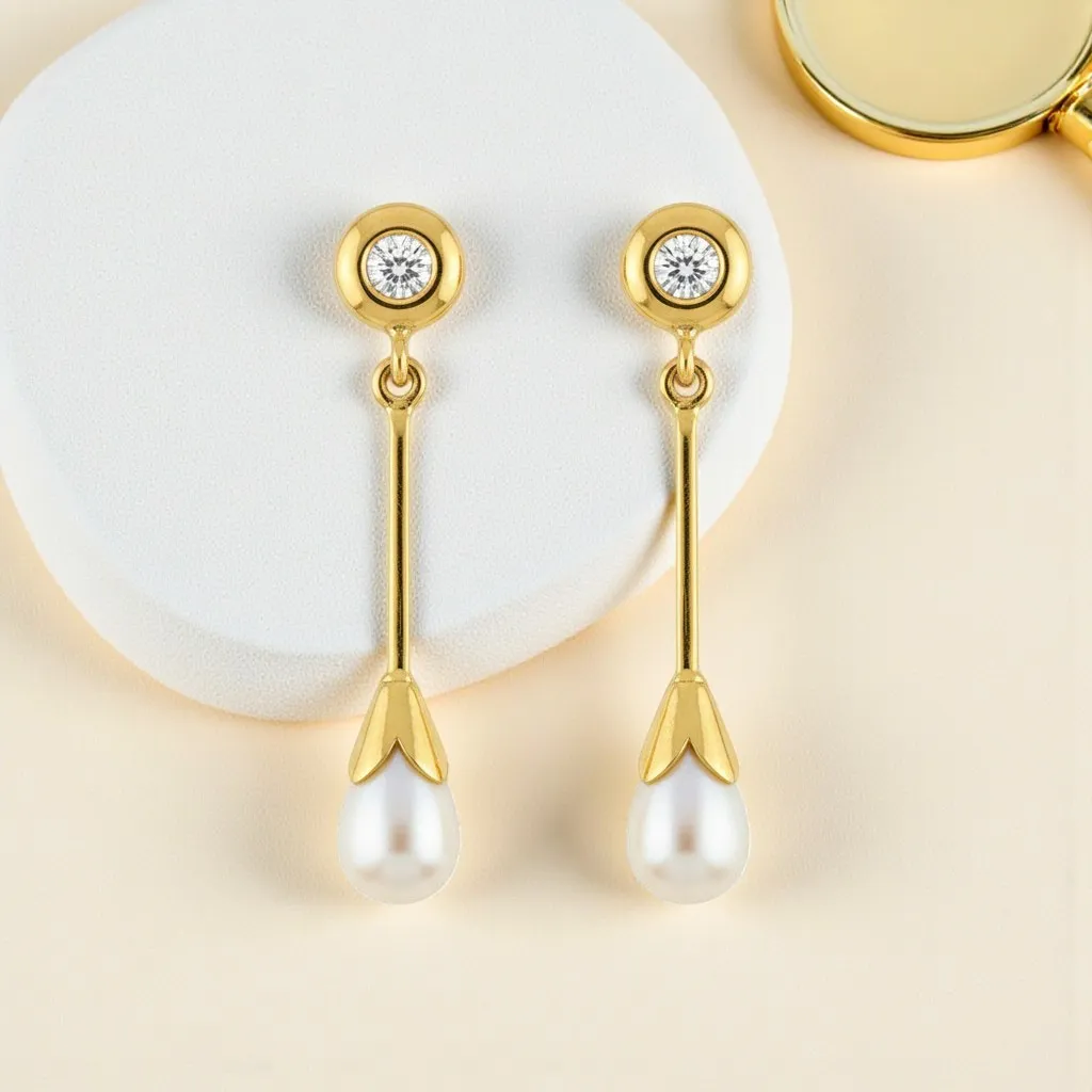El diseño presenta una perla cultivada de 4 mm de diámetro, elegantemente sujeta por una casquilla de oro que realza su forma redondeada y su brillo natural. De ella desciende un tramo de hilo de oro, creando una caída fina y delicada que aporta movimiento y elegancia al conjunto. En la parte superior, un chatón engastado con una circonita actúa como punto de luz, aportando destellos discretos y sofisticados.