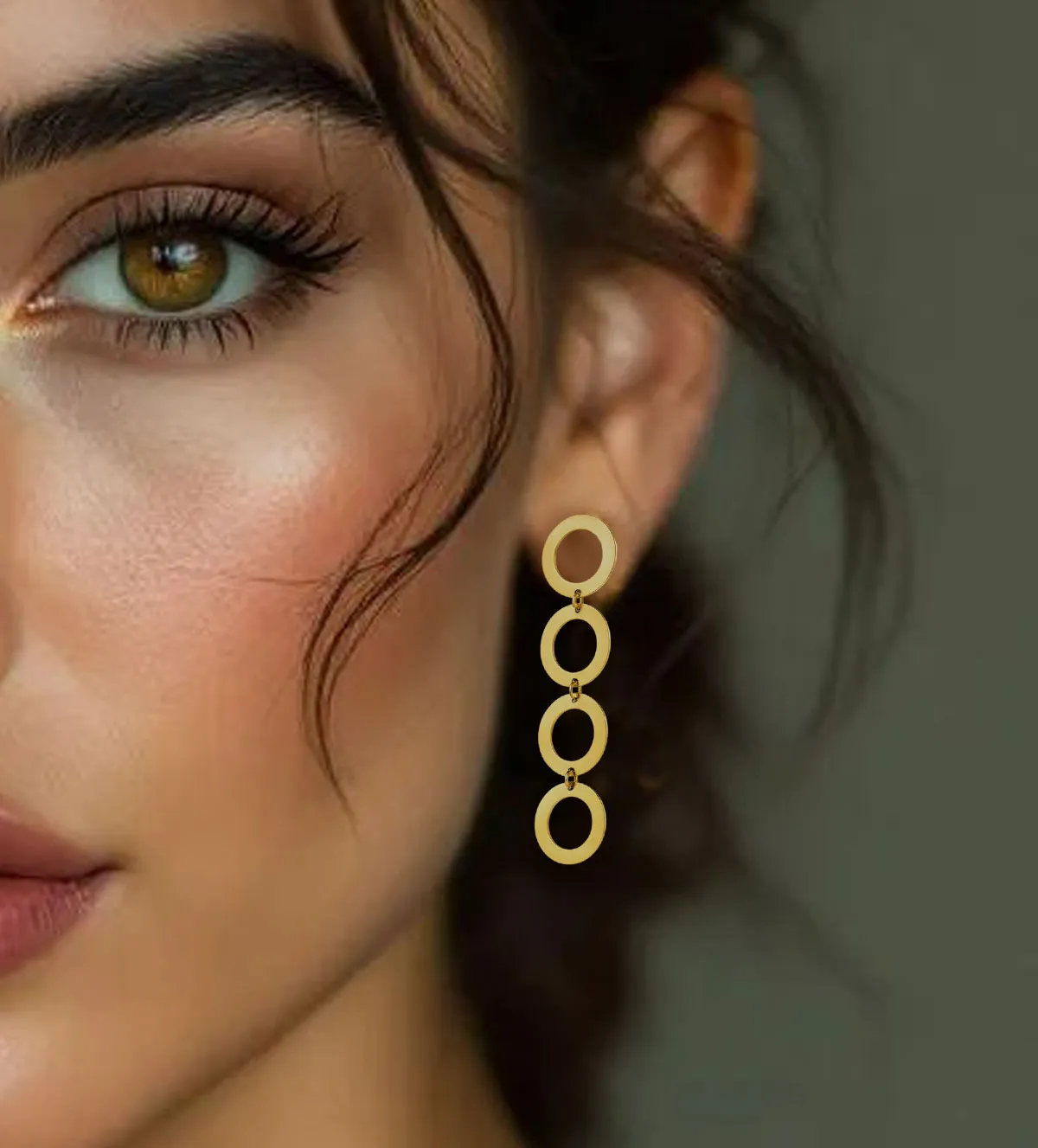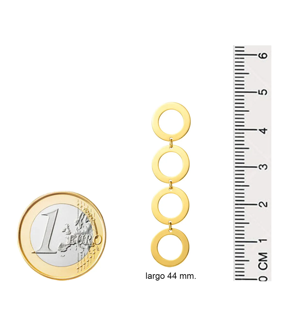 Pendientes de oro con un diseño largo de cuatro círculos calados que irradian elegancia y movimiento. Elaborados en oro amarillo de 18 kilates, destacan por su ligereza y brillo natural que realza cualquier look. Ideales para lucir con estilo en cualquier ocasión. Una joya moderna y atemporal, disponible en Rubí Joyeros, la mayor joyería online de España. ¡Consíguelos ahora antes de que se agoten, disponibilidad inmediata!