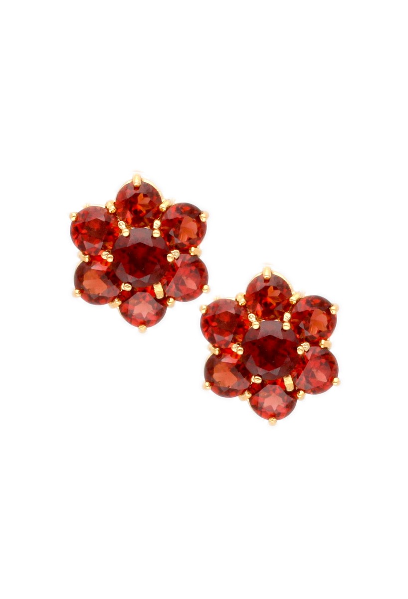 Pendientes oro 18k y granates, siete granates de precioso color entre rojo y anaranjado engastados en garras individuales formando una roseta orlada que se ajusta a la oreja mediante sistemas omega, los pendientes que siempre tienen que estar en un joyero femenino, combinan perfectamente con estilos tanto modernos como clásicos y se pueden lucir en oportunidades de todo tipo.