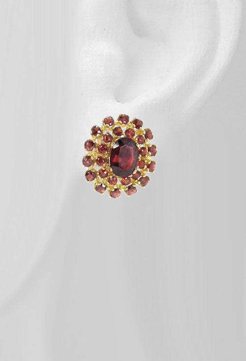 Pendientes oro amarillo 18 kilates con granates finos y sistemas de presión, diseño basado en un granate central de talla ovalada rodeado por una doble orla de granates redondos de pequeño tamaño, miden 15×17 milímetros y el par tiene un peso total de 6,08 gramos.