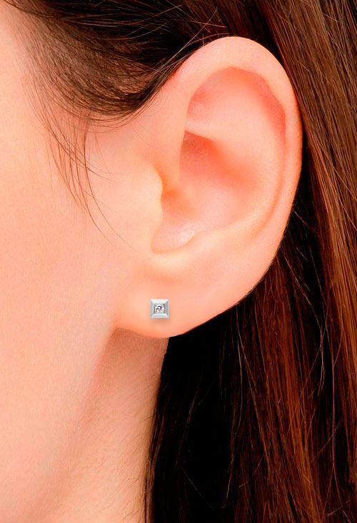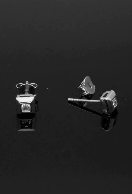Pendientes oro blanco 18 kilates y circonita chatón cuadrado, una joya polivalente que sirve a niñas, mujeres y hombres por igual, dipone de una circonita talla princesa engastada a ras y se sujetan a la oreja mediante sistemas de presión, unas aberturas laterales permiten la entrada de luz que aportan más y mejor brillo a las piedras.